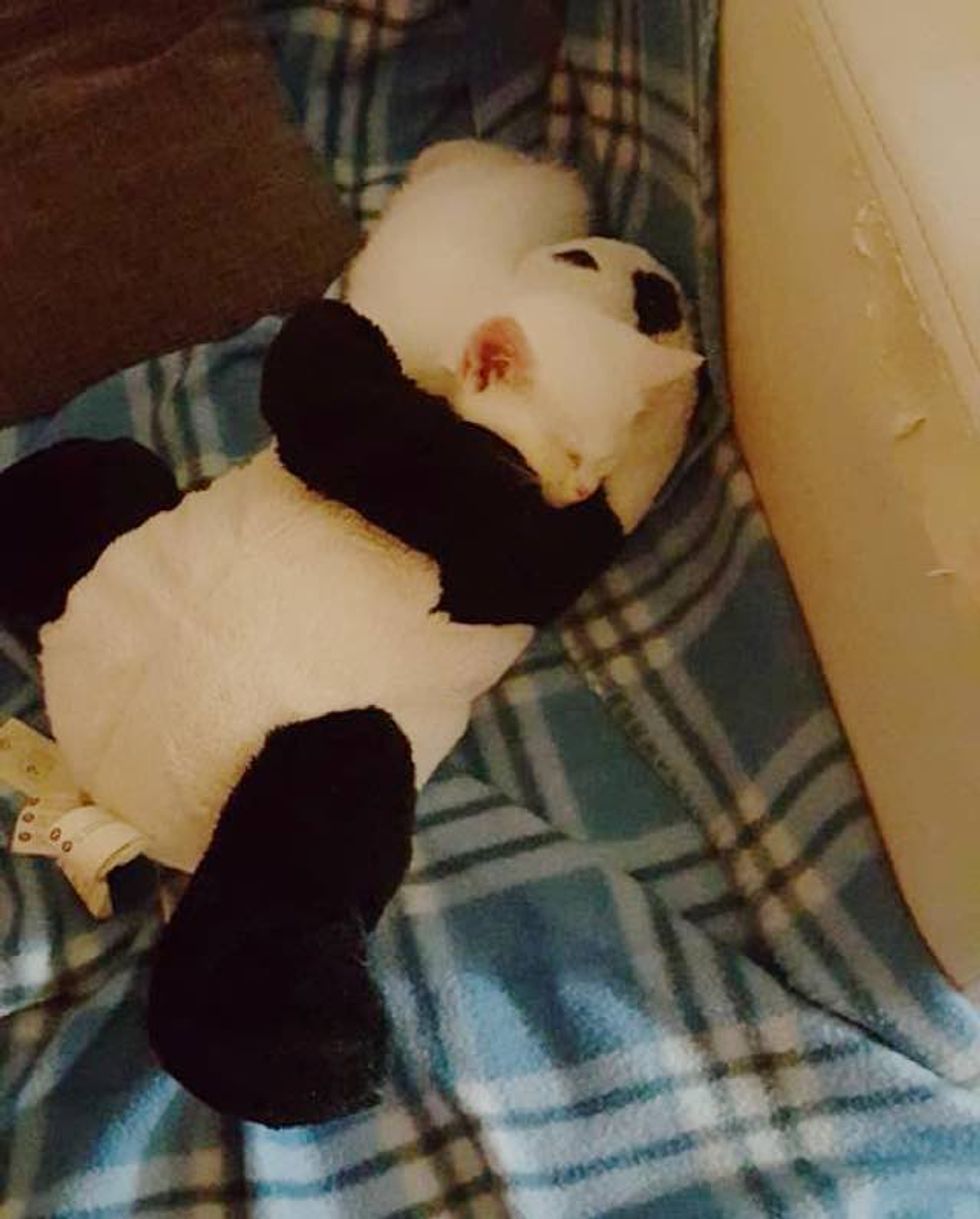 When Willy is out of the bag, he's cuddling with his panda :).