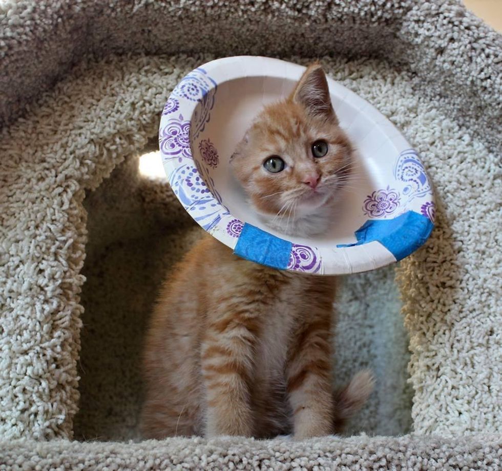 He was adorned with a cone fashioned from a paper plate to protect his injury. The little fur buddy let nothing slow him down.
