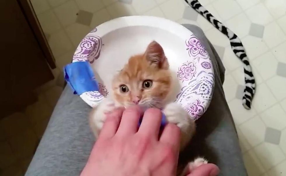 "Hearo was too small for a standard E-collar to prevent him from scratching his ear, so his foster mom made one, and Hearo was able to play like any other kitten."