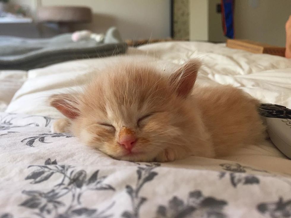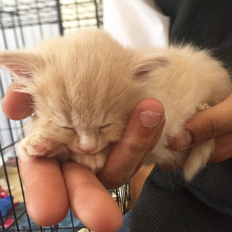 The cream kitten was so tiny that Jessica had to syringe feed her. As soon as the kitten latched on, she ate like a champ.
