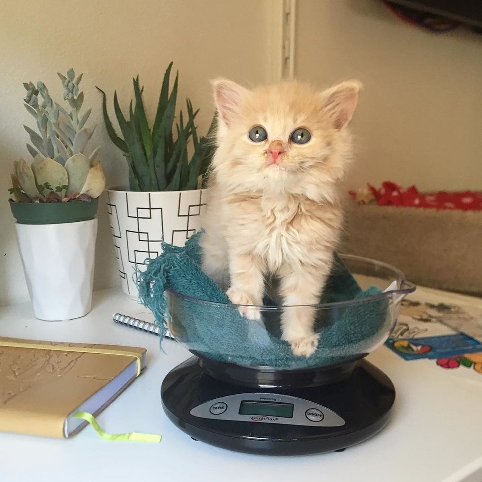 At eight weeks old, Cider reached two pounds. Jessica knew that the kitten was almost ready for adoption.