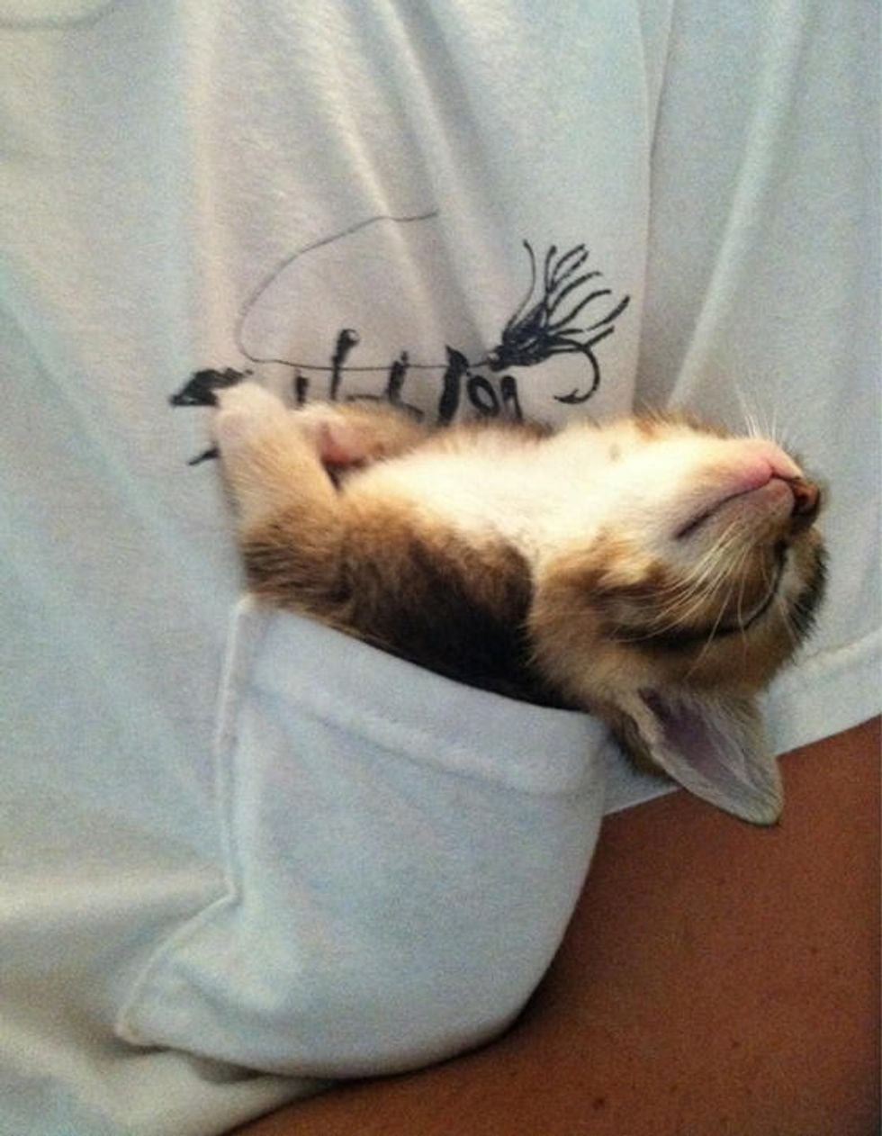 Her human said: "She fell asleep in my roommate's pocket like this."