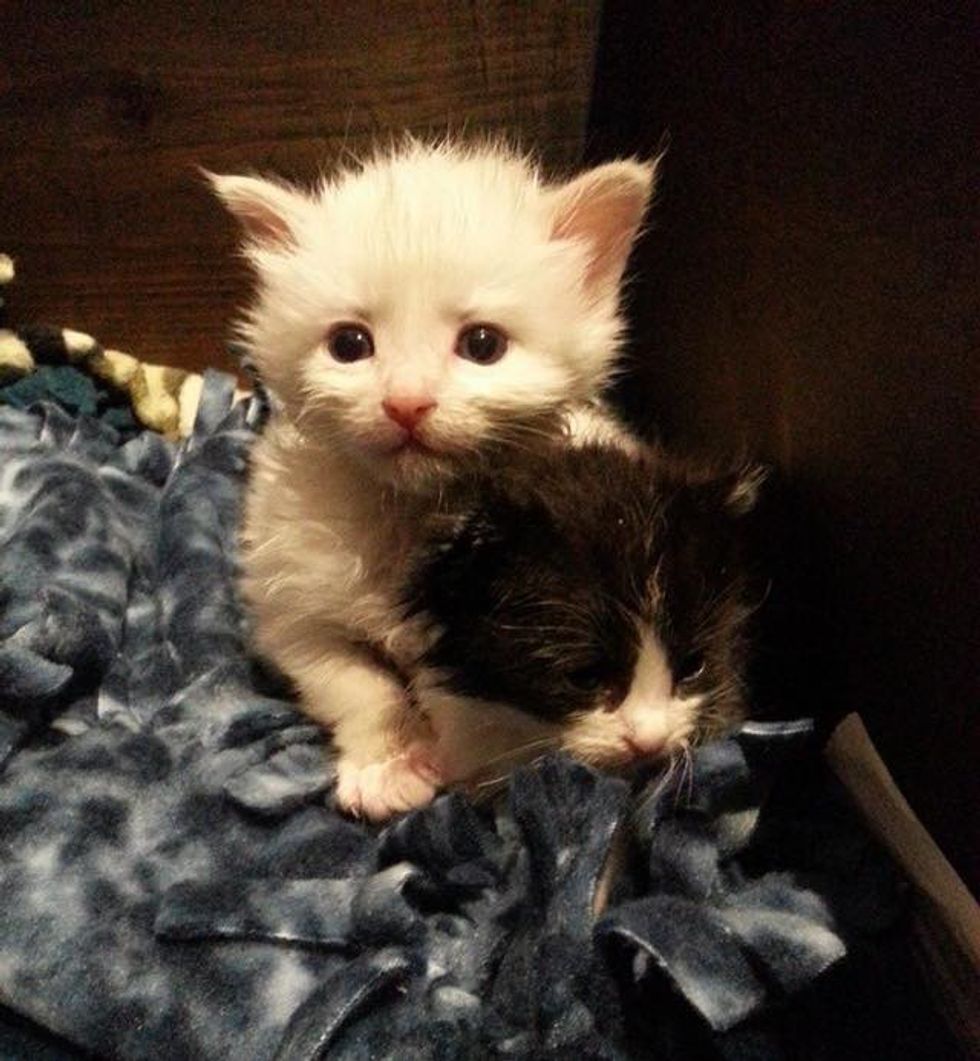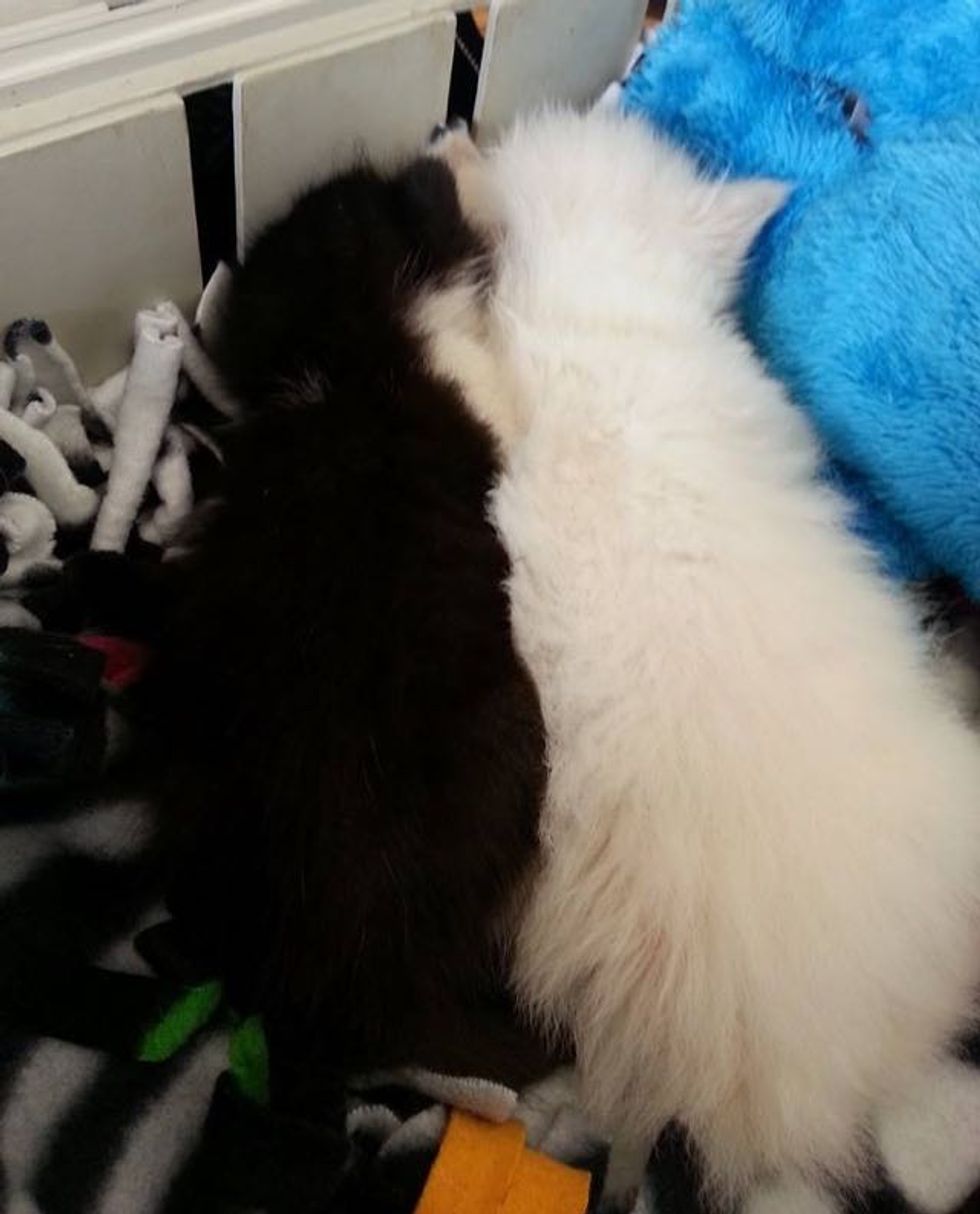 "They are curled up together now sleeping. Pinky is in good health for what she's been through, about 2 weeks old. She has fleas but we got a lot off at the vet and she had a Dawn bath as soon as I got her home.