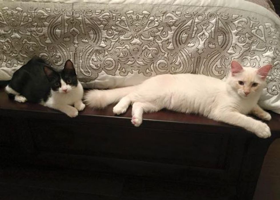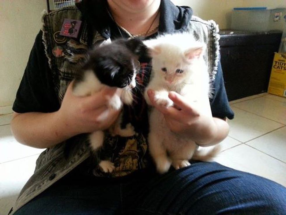"Stitch was one of three born from feral parents in the backyard of a friend's house. While Stitch was being cared for a second kitten arrived at the care giver with a similar feral and abandoned story. This kitten was named Pinky. Stitch and Pinky quickly bonded and became friends." (More info: Stitch and Pinky)