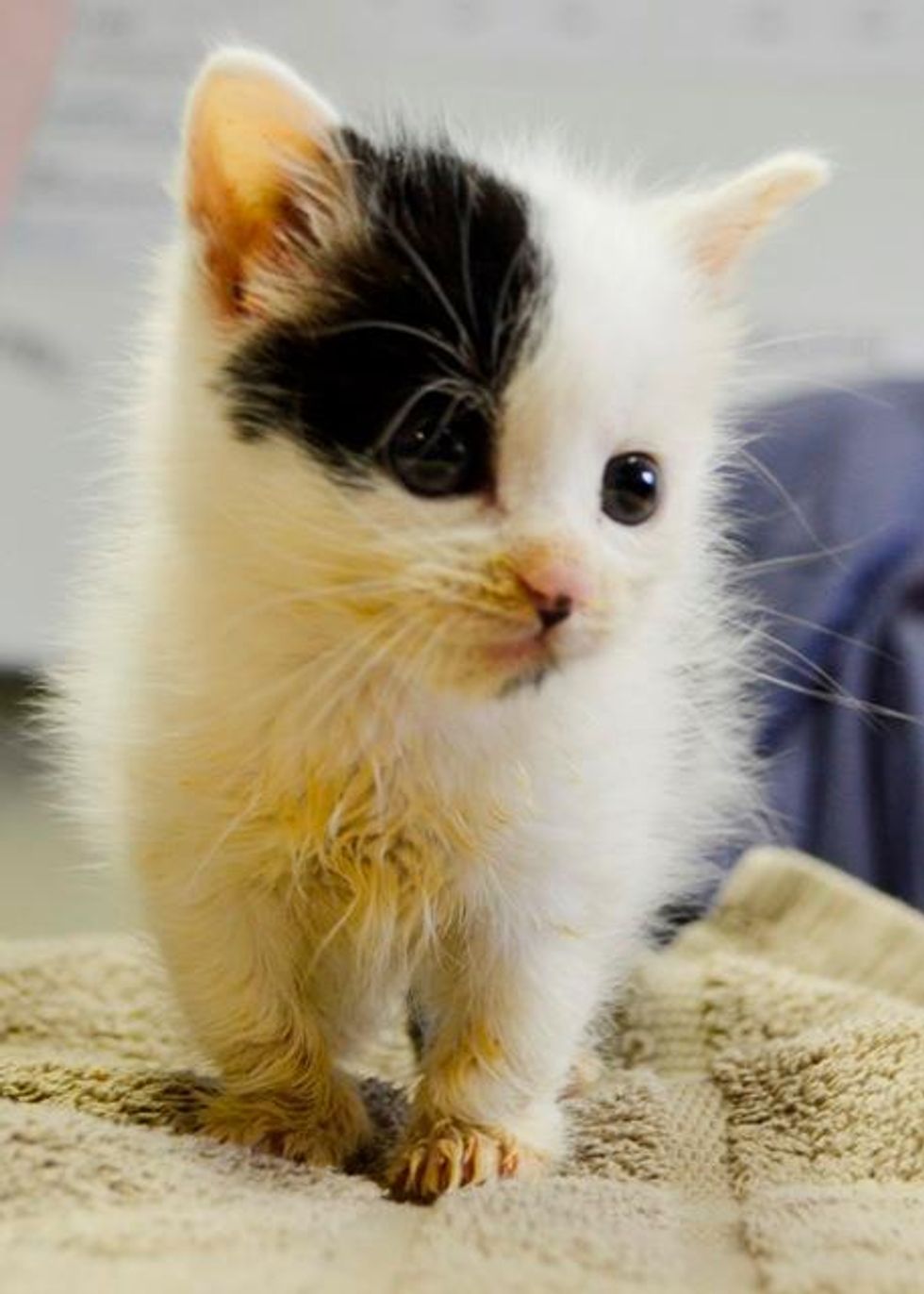 Pebbles came to Cats Protection Bridgend Adoption Centre when she was in very poor condition where she had to be admitted to the vets a few hours after they took her in. She "is back with her fosterer and is doing much better. She was brought in by a member of the public who found her on the side of the road. She is 7 weeks old but is the size of a 4-week-old kitten. She had to have a lot of TLC to get her eating but looks like she is turning the corner now. She had to have a few baths initially as she got into such a mess when eating, but she loves being dried with the hair dryer. She is adorable and is a super friendly kitten," said the shelter.