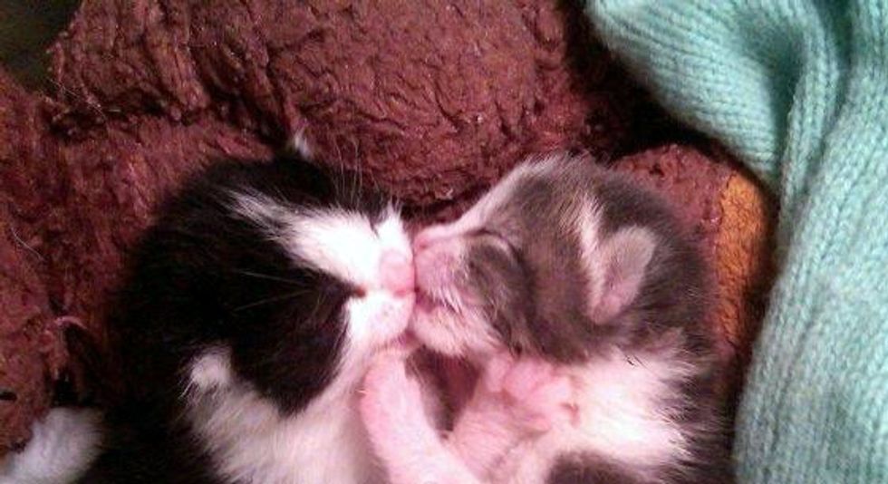 They were about a week and a half old when they arrived at the Big City Little Kitty foster home. Their eyes hadn't opened and both weighed in at a little over 5 oz. The little black and white kitten was not in very good shape, so Stephanie gave the kitten fluids every two hours to nurse the little one back to health. "Kittens this young really struggle to make it without their moms, I'll do my best," Stephanie added.