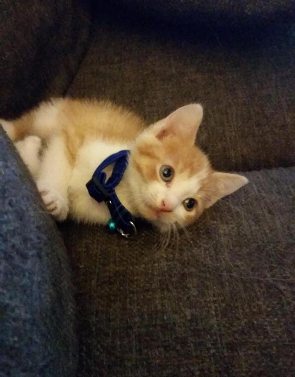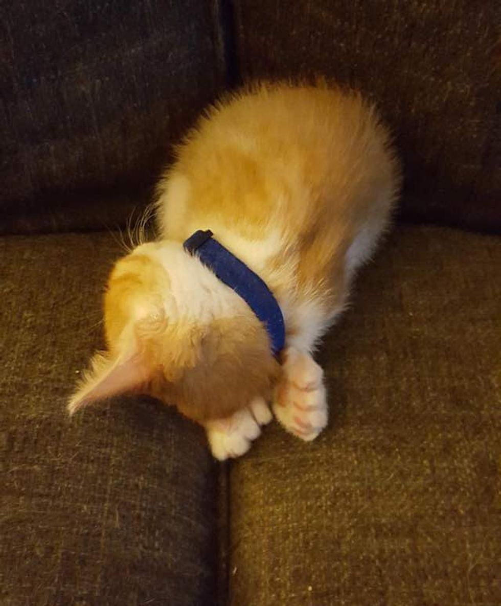 "He was heard meowing in the bushes by my wife," he adds. As Kate was tracing the source of the cries, she spotted a little fur ball in the bushes whose ribs were showing. It was apparent that the kitten hadn't had much food. They took him in, fed him and gave him shelter.