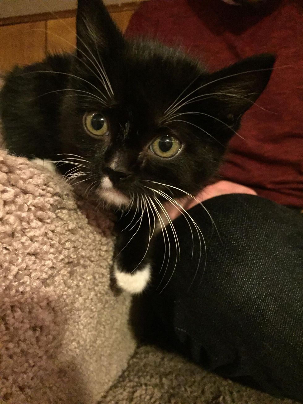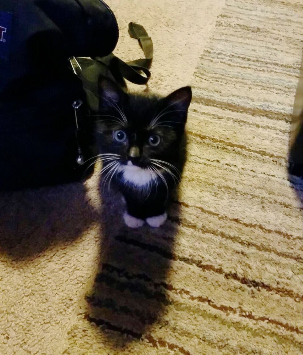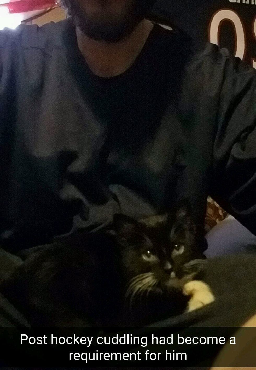 "We eventually coaxed the little guy out and brought him back to my apartment. His name is Catrick Kane, after Patrick Kane, the Chicago Blackhawk who scored the game winner the first night. Catrick was brave enough to come cuddle with me on his own accord."