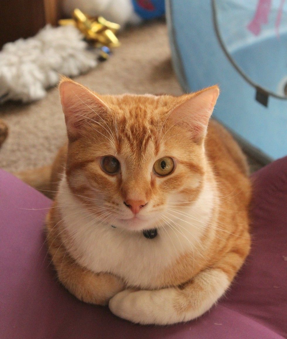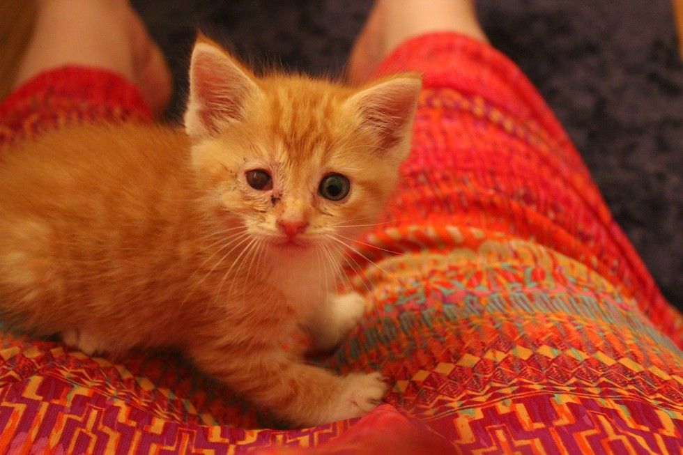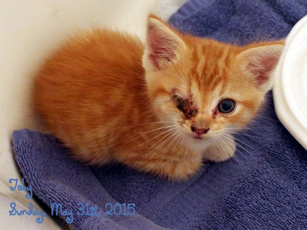 Today, Toby still has a scar on his right eye and has a little trouble seeing but he is NOT blind in it, and he's doing well. Several months ago Toby was sick with a 'cold' and we took him to the dr. We found out that Toby has herpes which is quite common among cats, especially when young and exposed to it. He will always have herpes, but for him that means he will have frequent colds, stuffy nose and watery eyes. We keep our home extra clean and make sure nothing gross gets onto Toby's face or around for him to eat. He's a wonderful cat! My other cat still doesn't really care for him but they get along! :)