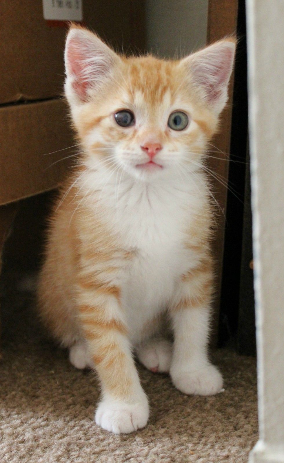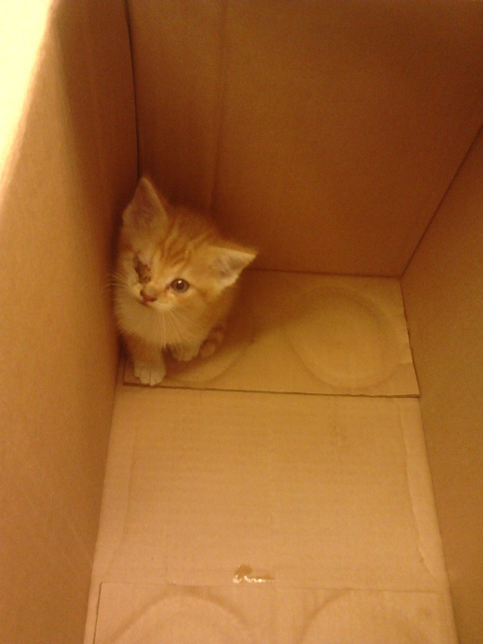 I would like you to meet Toby. A co worker and I rescued him at my work- CVS. A woman in the pharmacy told me that there was a terrified kitten in the pharmacy drive through. I wasn't able to go out side at the time so I had a co worker bring a box and head outside to help the little guy out. My co worker came in with a tiny 4 week old orange kitten. Here's is the first picture I took of him: