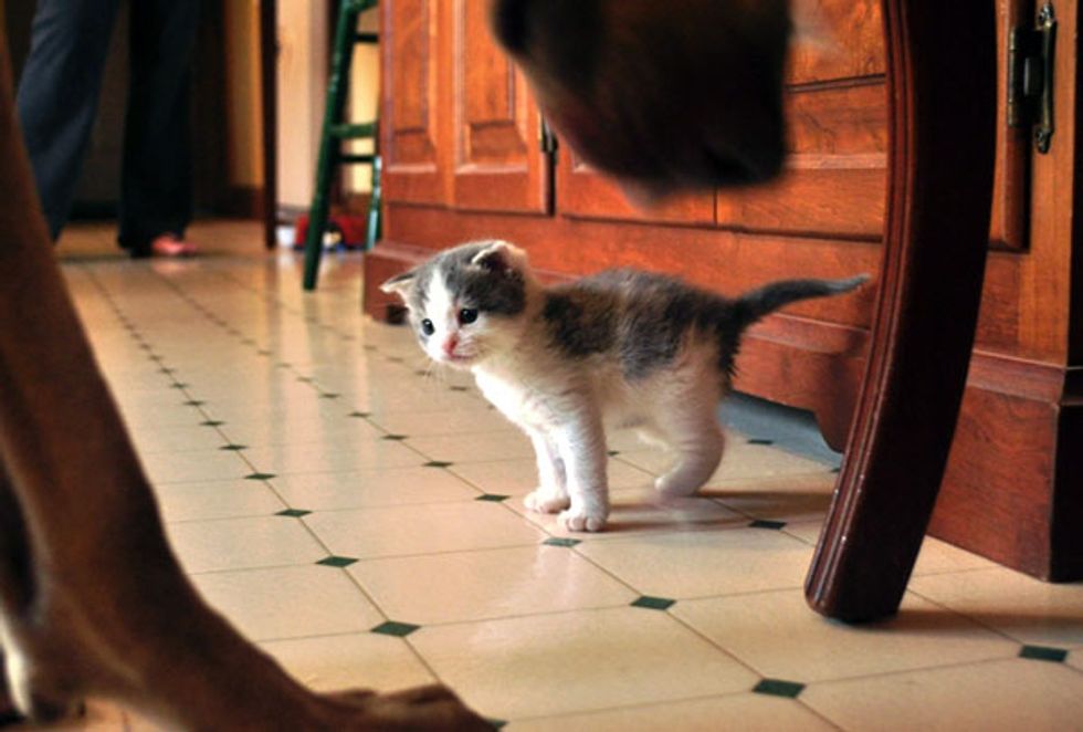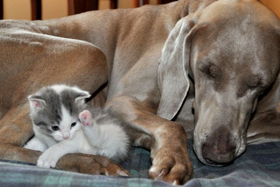 They named him Toby and were planning to find him a good home in 3 weeks because their cat Cally had never lived with another kitty, but it turned out that Toby was taken in by a much larger friend, a dog named Lucy. While Cally was not very pleased with the new comer, Lucy had a different story. "Gradually we introduced the new member of the household to Lucy, so she would know this was "her" cat... Eventually we let her sniff the cat. She was in love. After we felt it was safe, we put the kitten on the floor. Lucy laid down next to the little thing and assumed the nursing position, getting in occasional gentle licks. That was it. Lucy finally attained motherhood. Kitty is her puppy," Julie writes on her flickr.