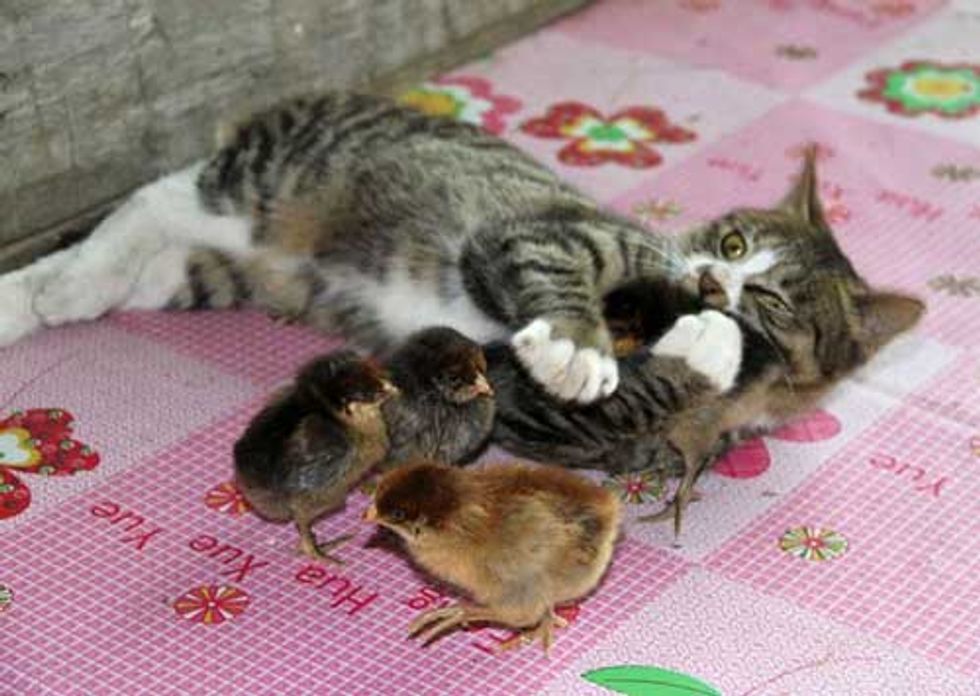 A cat adopts 30 little chicks, grooming and caring for them like her own. [click to see more photos of this incredible story]
