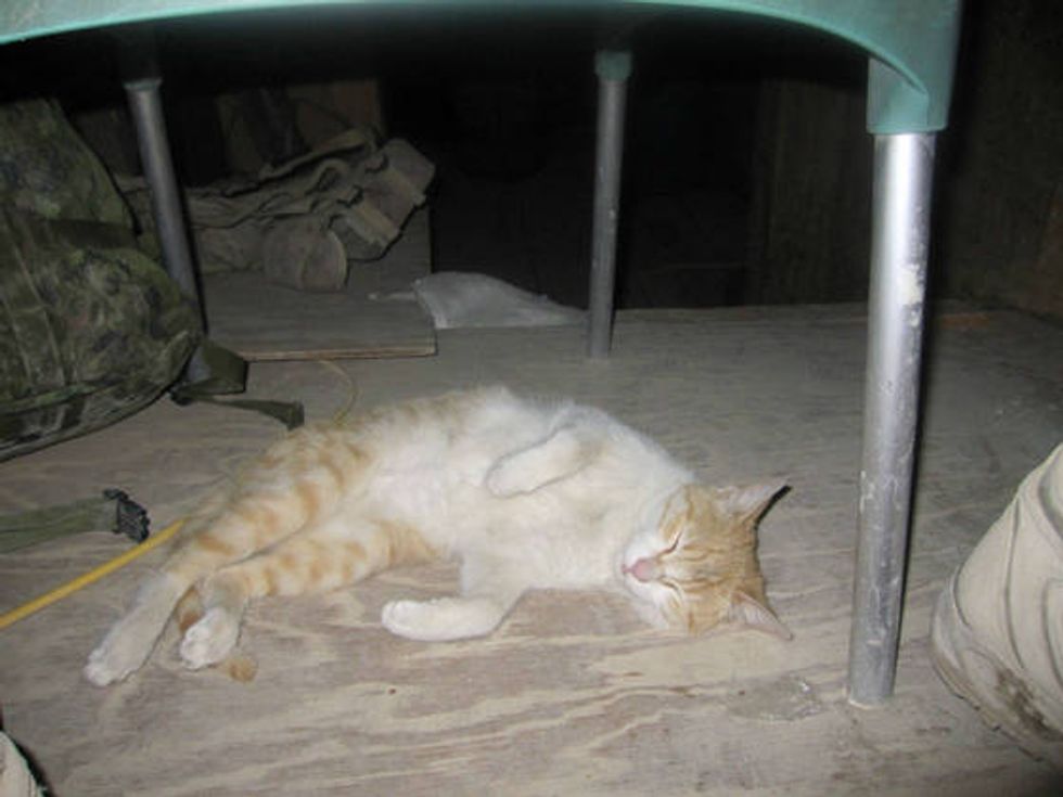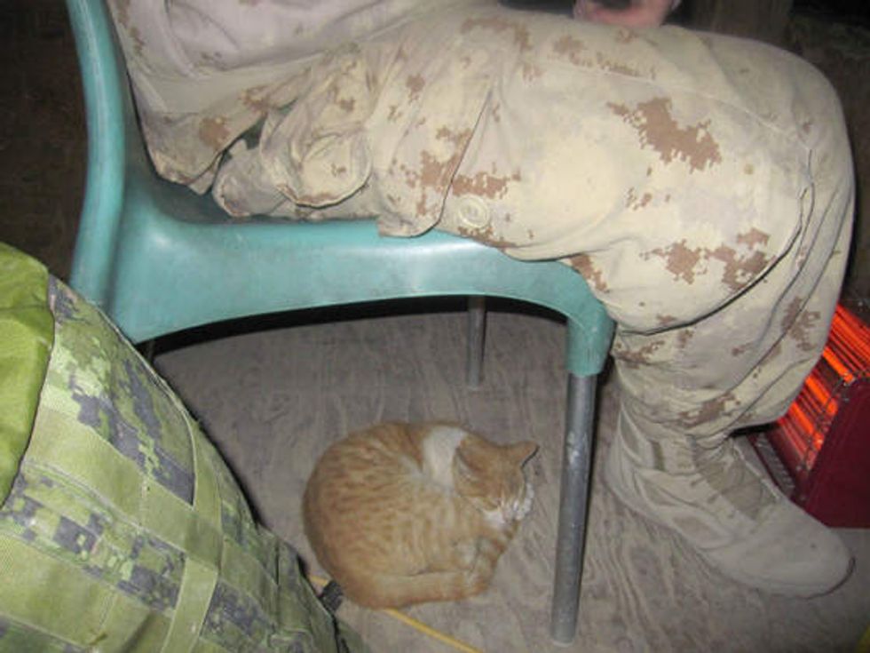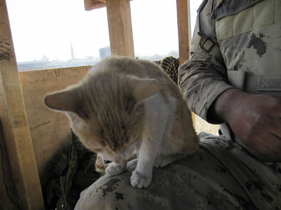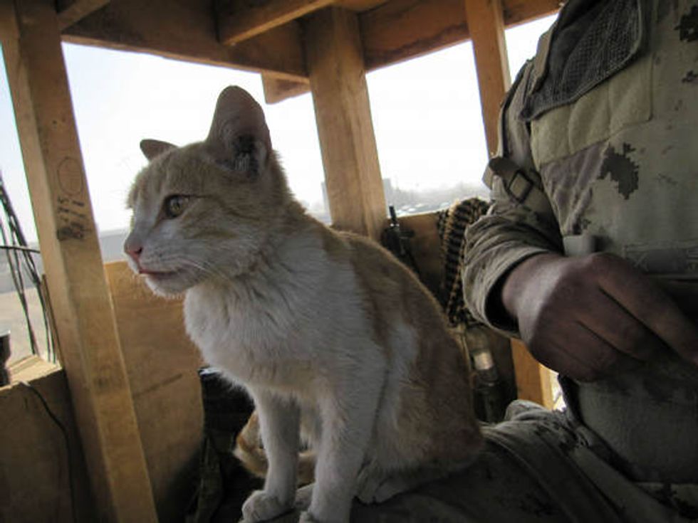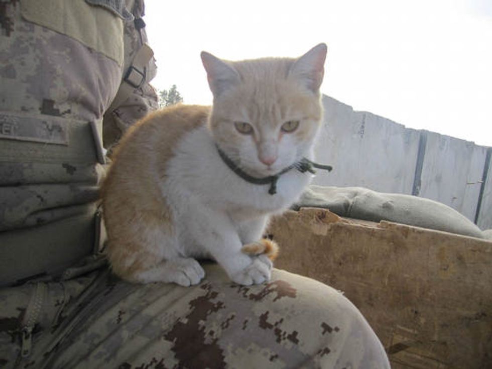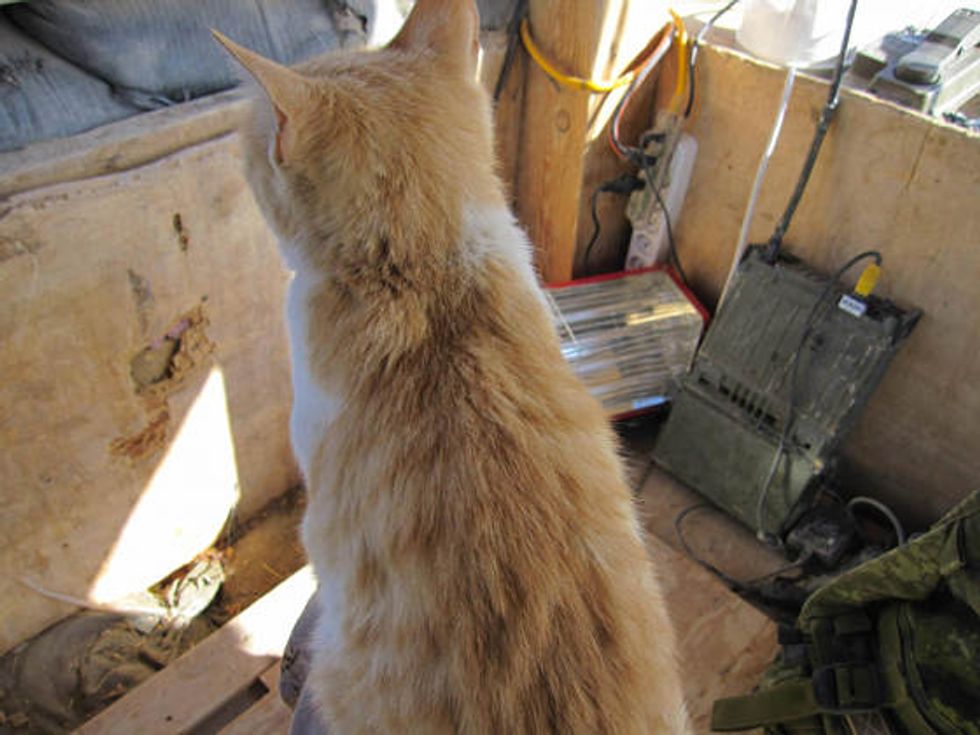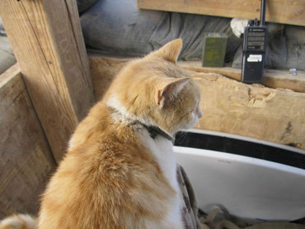 A ginger kitty helping soldiers guard their camp in Afghanistan.