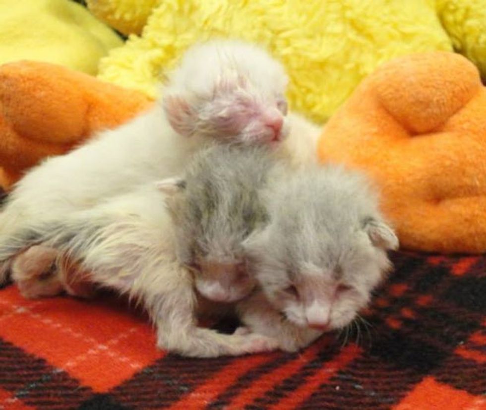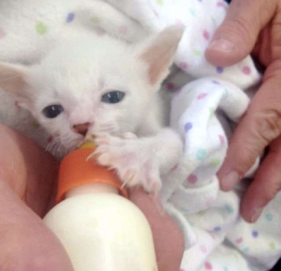 Kitten Rescue Los Angeles volunteer Laura Hawthorne wrote: "These babies (Pretzel and her siblings) were born on June 19th and within hours of their birth they were dumped at a local animal control facility, presumably to be euthanized. As a notorious 'sucker' for both abandoned newborns and special needs kittens, I was contacted about bottle feeding and caring for these fragile little angels."