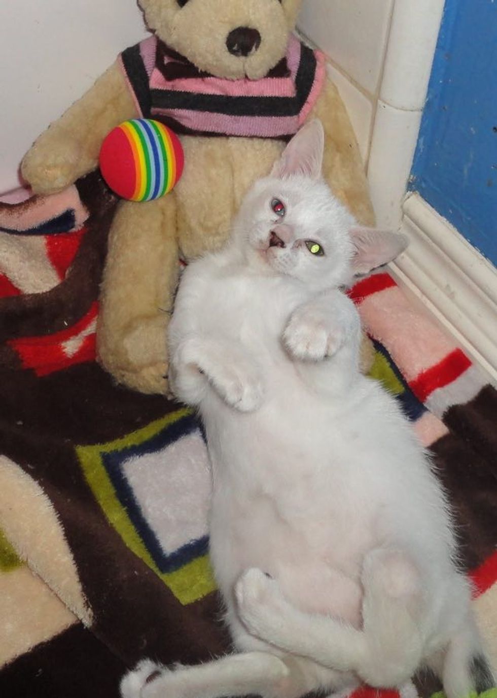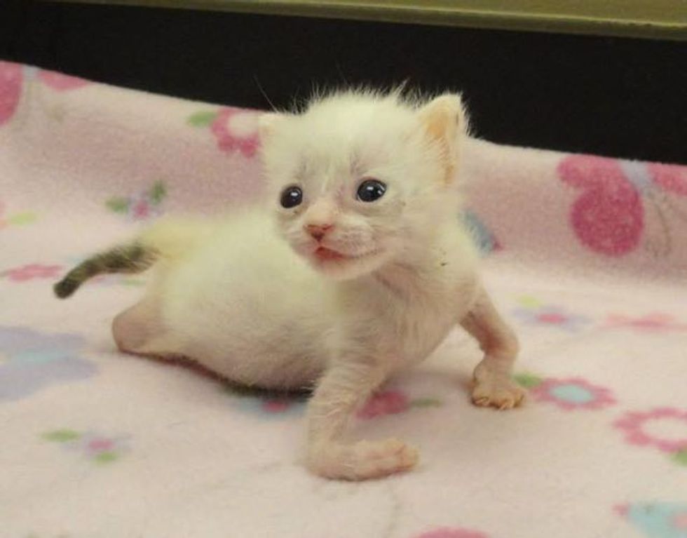 "She faces mobility challenges, but despite the crappy hand she was dealt, she's a very active, playful and sweet kitten that purrs the second you pick her up. Because she's been this way since birth, she has no idea she's different from other kittens. She scoots around quite well and is a happy little camper. While her life may never be that of the average kitty, she will surely shine in her own way. "