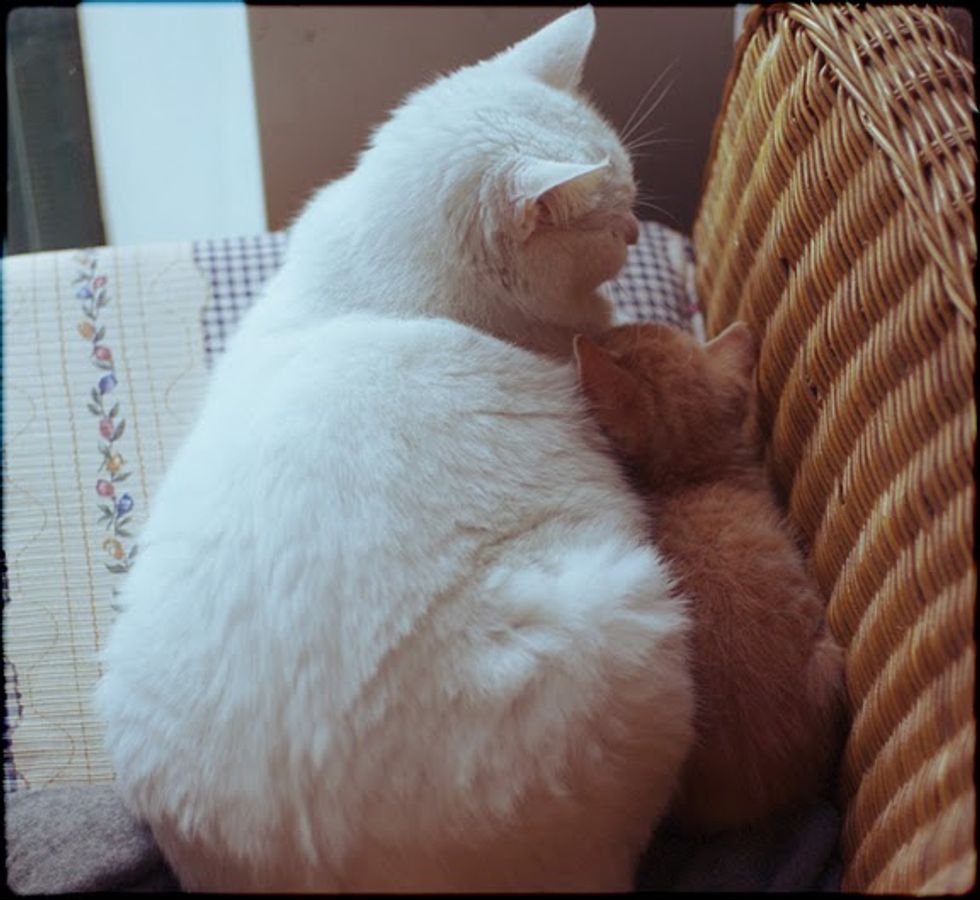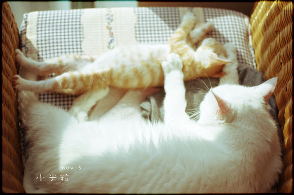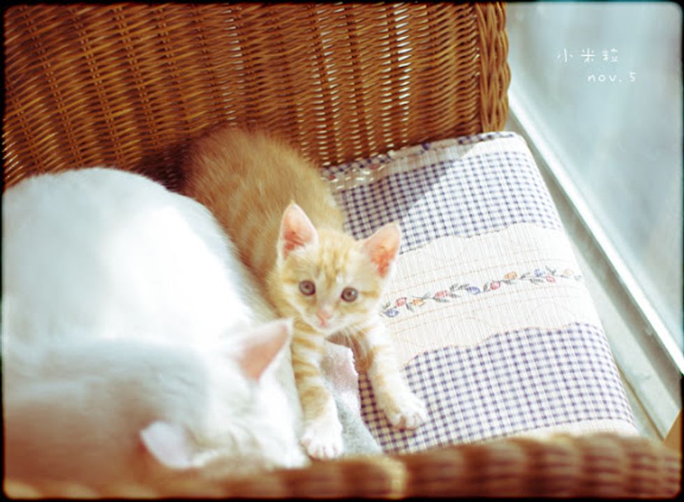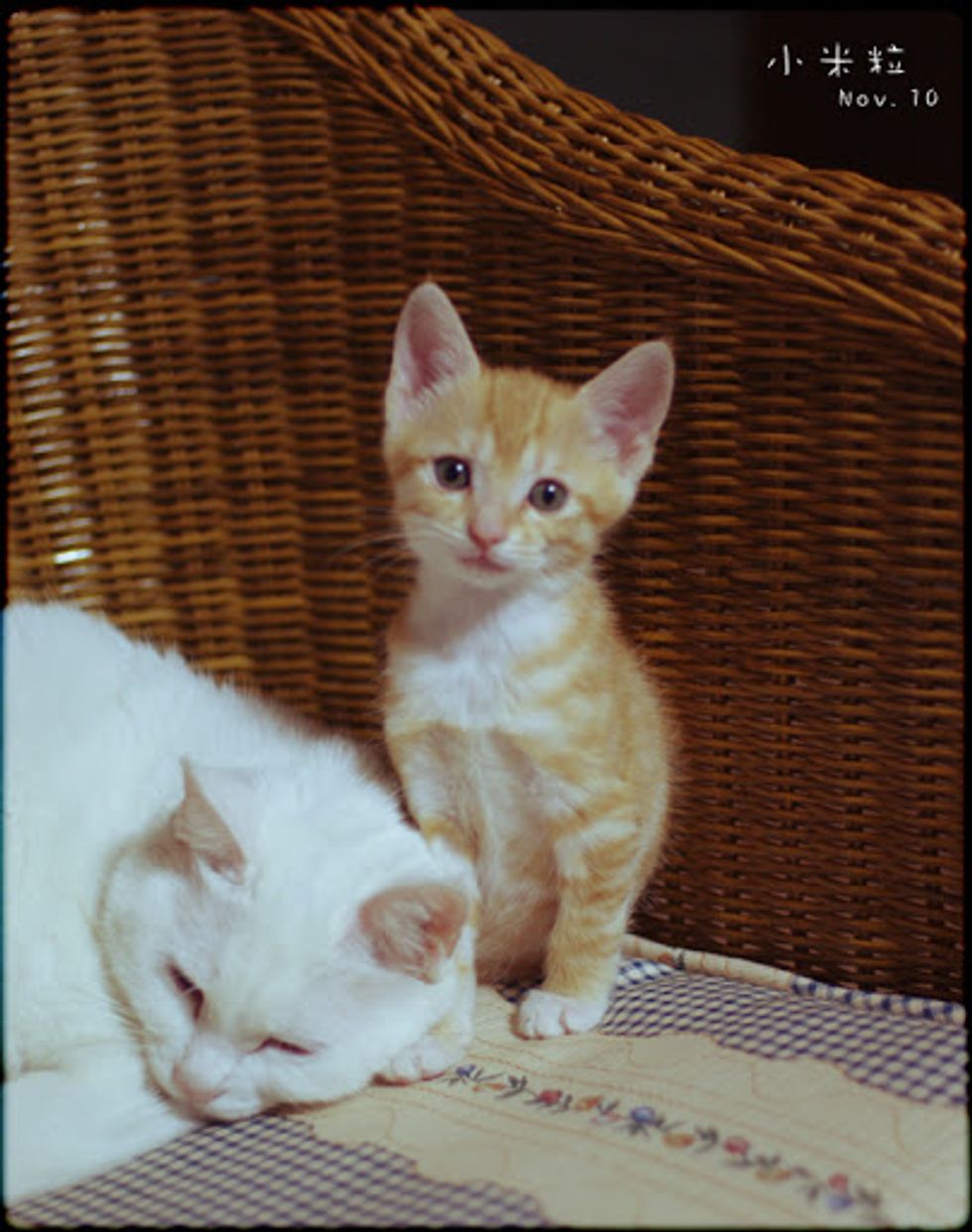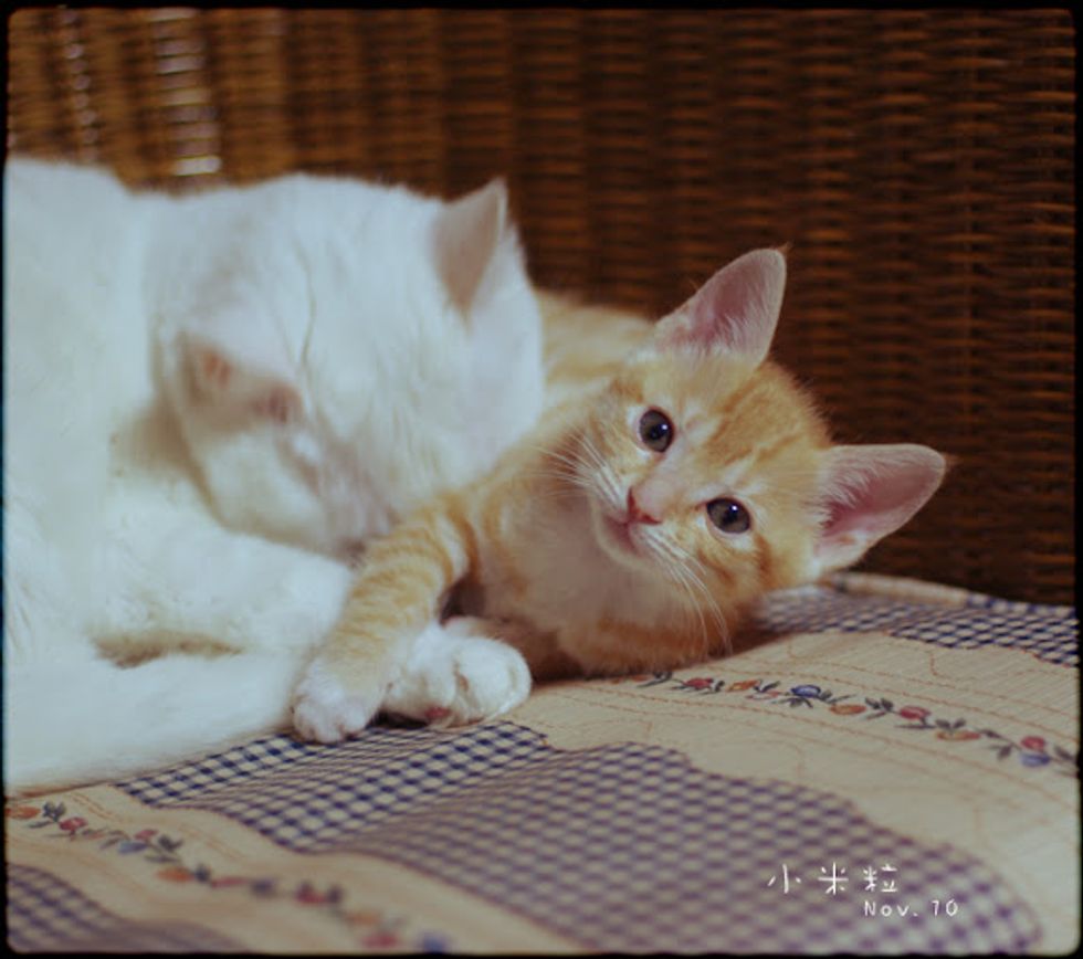 Rice, the ginger kitten was abandoned on the street and later rescued by Tifa when he was only a few weeks old. Blue, the white cat used to be a stray and had a few litters of kittens before she was rescued and homed by Tifa. The two met each other and they have been inseparable ever since.