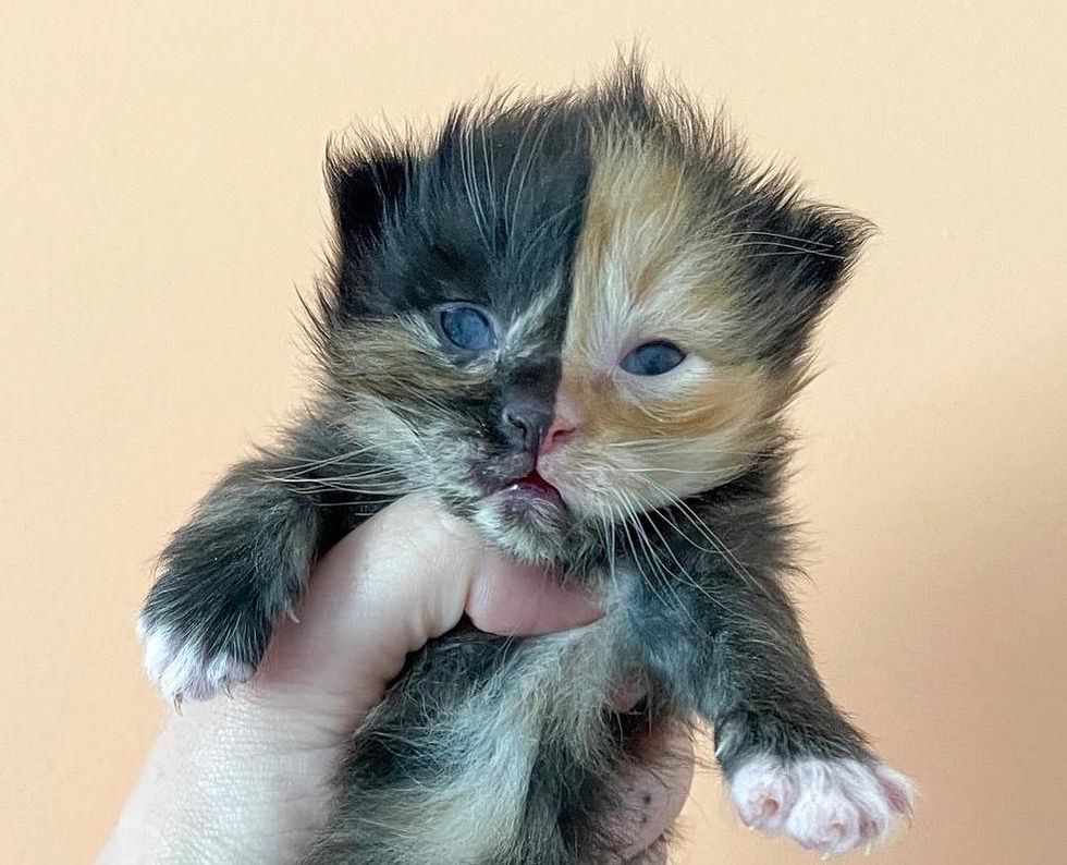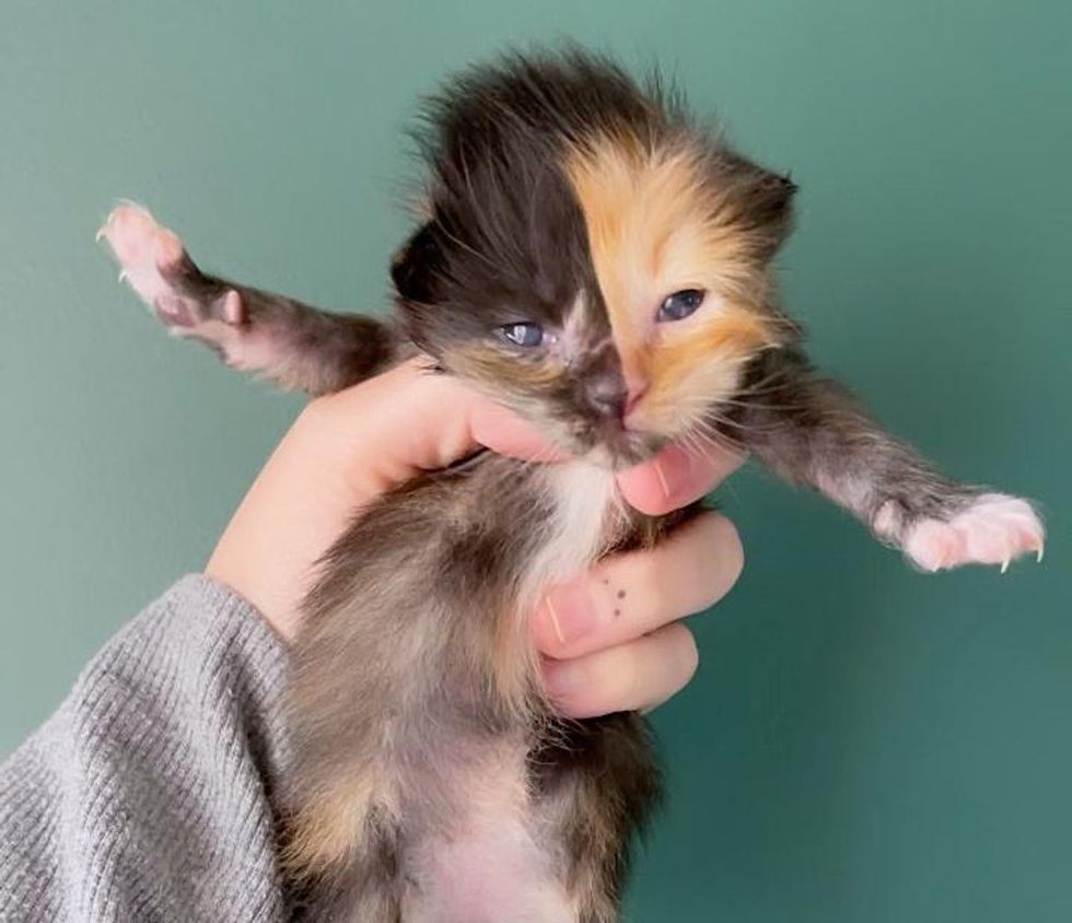 One of the kittens was born with a perfect split face where one half is black with splotches of orange and the other is covered in orange tabby stripes.