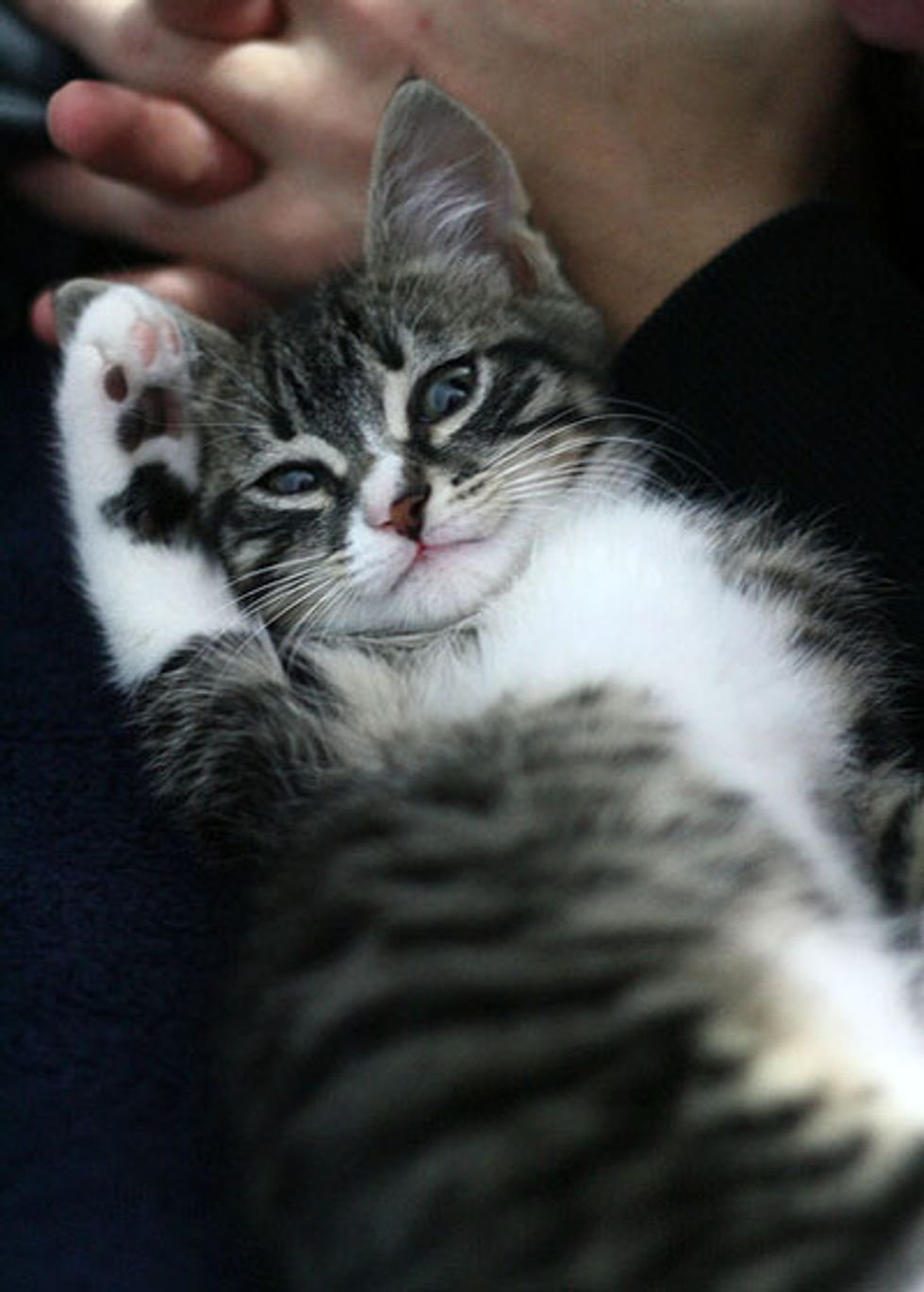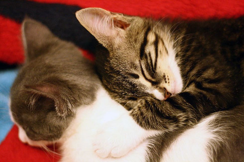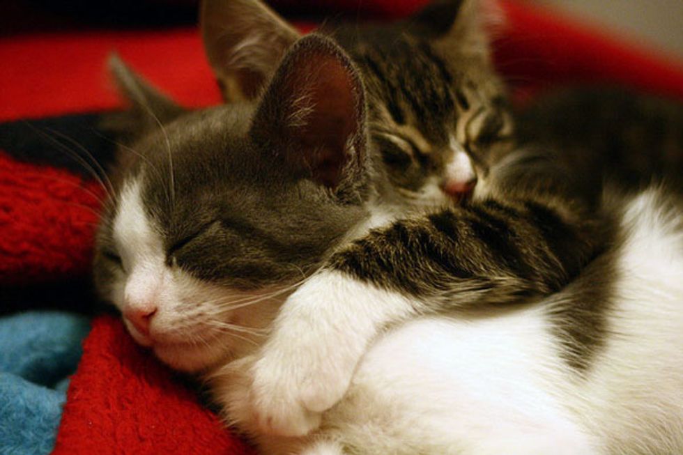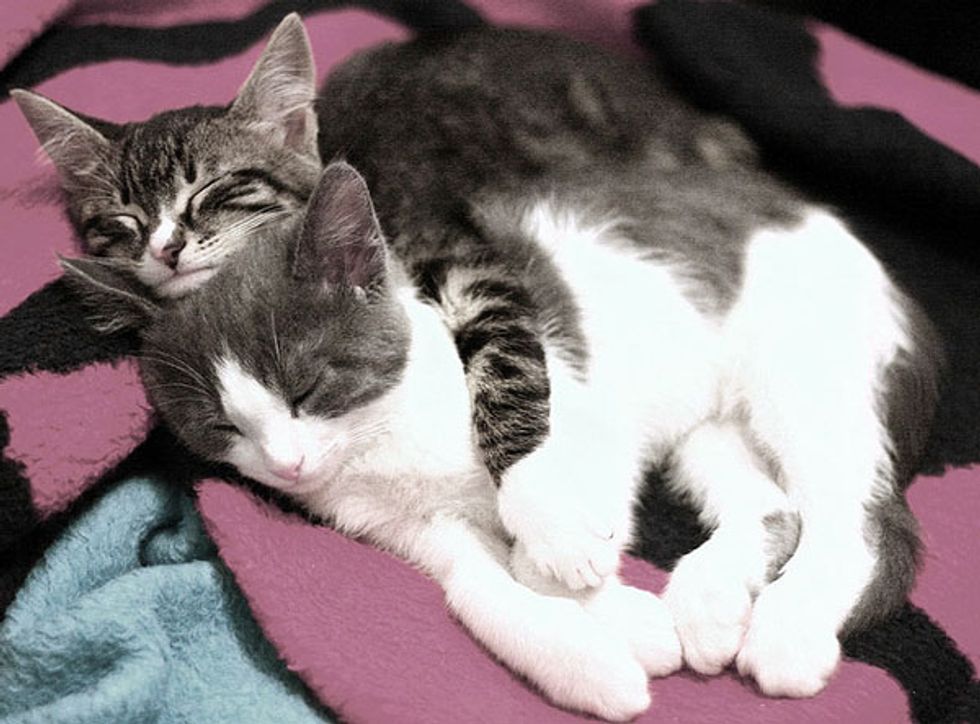 A fuzzy grey and white kitten was rescued on the street when he was only a couple months old. He was introduced to a tabby kitten whom he was not fond of when they first met, but things quickly changed. Day by day they got to learn about each other and realized they could play together and snuggle when they sleep. Today, they have become best friends, always cuddling each other when they snooze. The two boys are like two peas in a pod, completely inseparable.