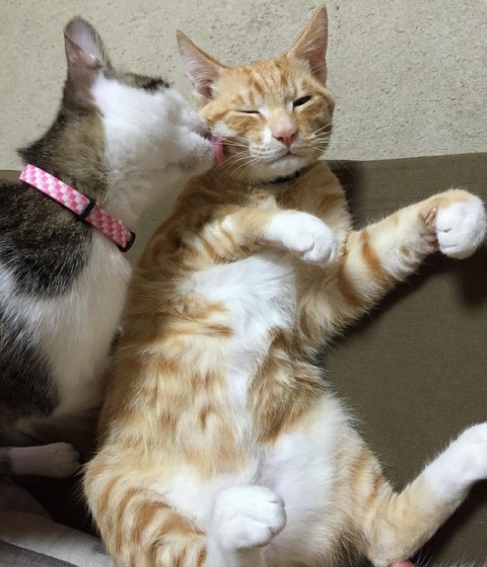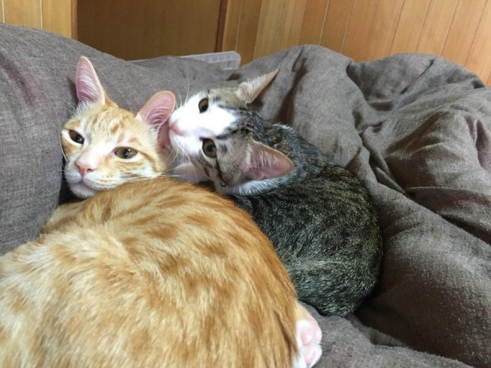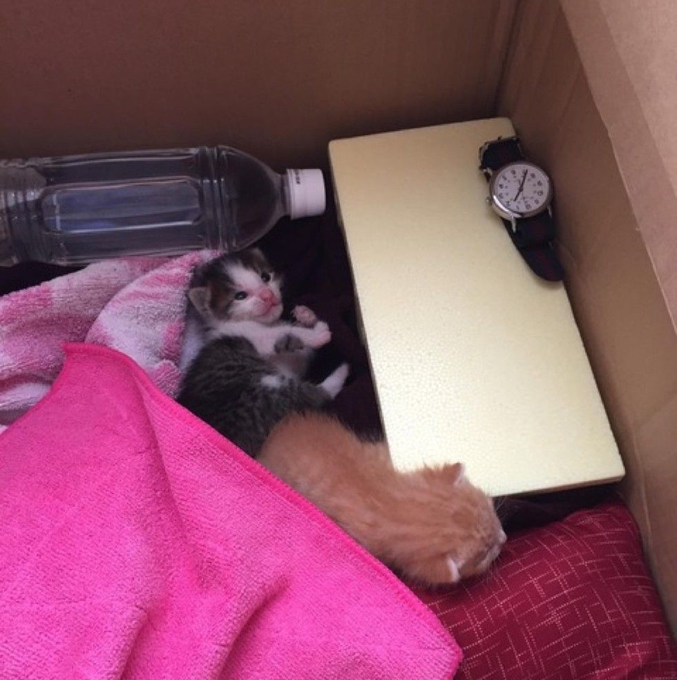 A good Samaritan was out shopping when he heard a cat crying in a parking lot near the bushes. Two kittens, just a few days old, were found in a box. A few hours later, no one came back to claim the kittens, and that's when the kind person knew he had to do something. Knowing the typhoon was approaching, he decided to take the kittens home. (nekomemo)