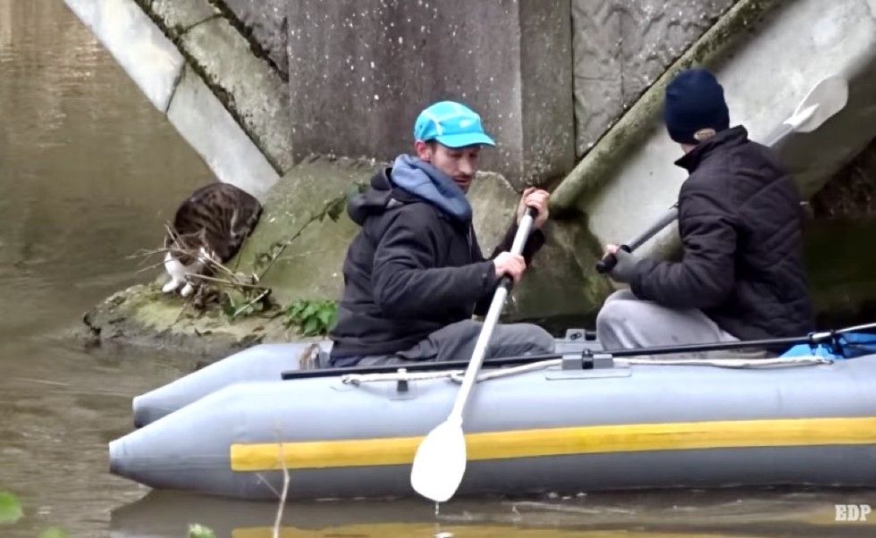 The kitty was spotted on the base of Dolphin Bridge (Norwich, England) by a cyclist Becky Steel who quickly alerted two men close by who were preparing their boat. Stephen Hawkes and Danny Mealey paddled out to retrieve the cat.