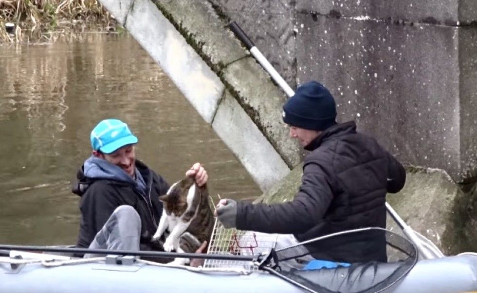 The men set out their boat and carefully approached the feline, trying not to startle her. Once they got close enough to reach the cat, Hawkes grabbed her onto his boat.