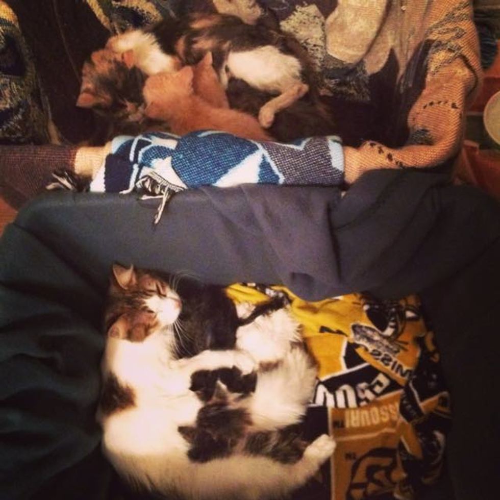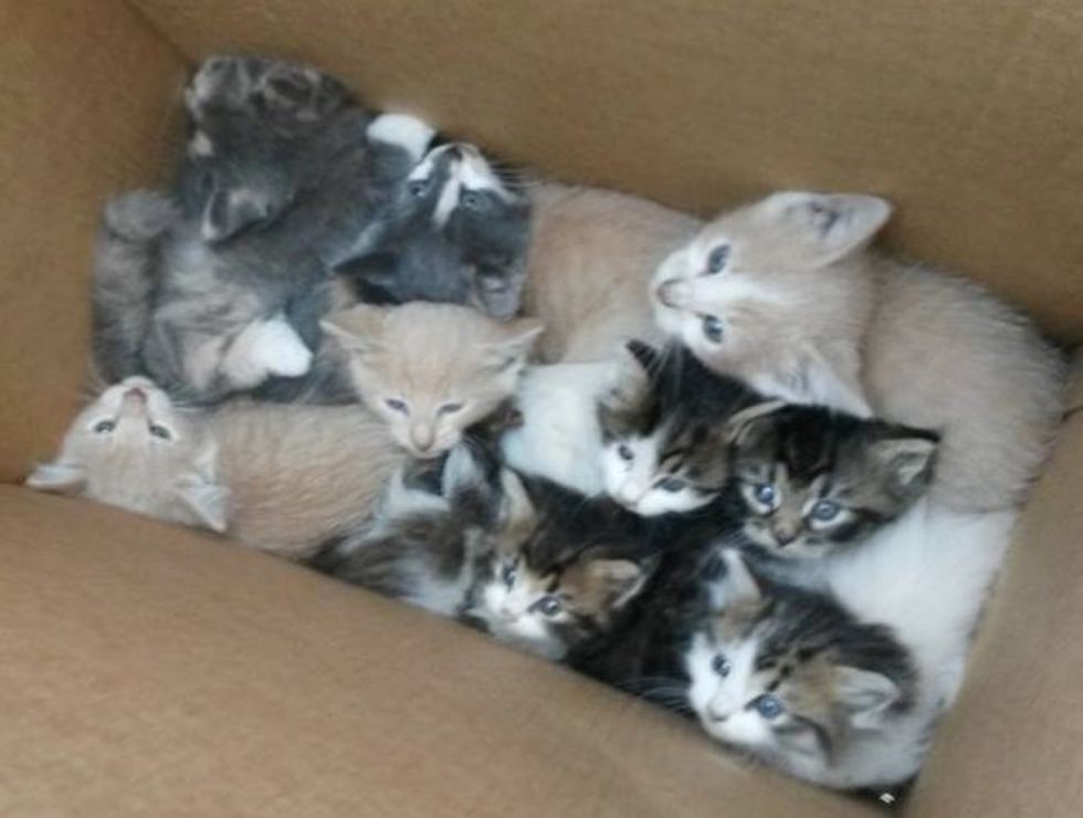 "This past summer while visiting friends in another town, we decided to go for a hike. While we are driving through the woods looking for trails near the road, my friend yells 'KITTY! There was a cat back there! Turn around!' We end up in a gravel pull-off and see a cat sitting next to the road. She comes up to us and starts meowing and rubbing up against our legs. Then, before we know it, another cat emerges from the woods, then we see more cats! Turns out, there were two mama cats and their nine babies that had been abandoned in the woods.