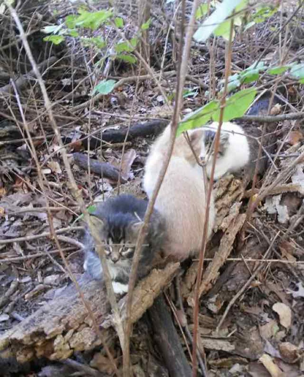 Their babies were scared so we had to hike through the woods and find them. The mamas helped us get their kittens.