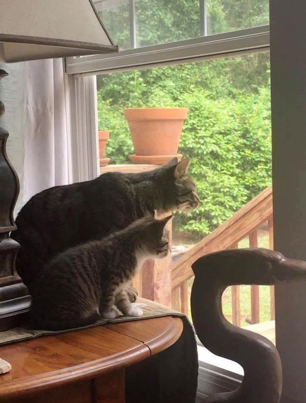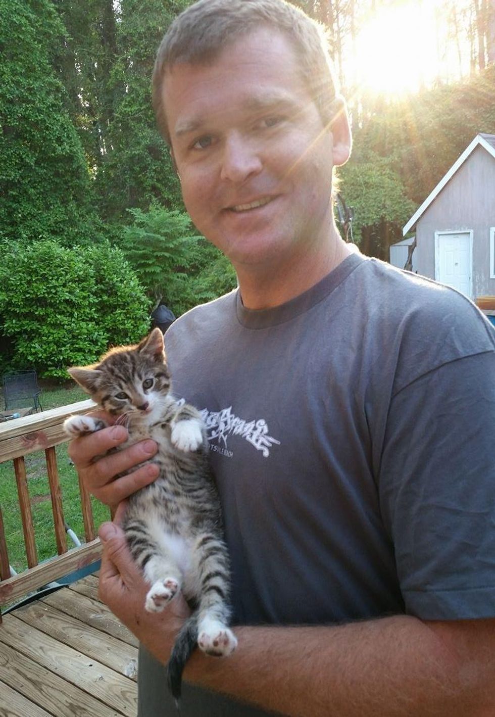 "The kitten is really doing great in his new home with my wife and I, his big sister 'Grouper' the cat and 15 chickens outdoors."
