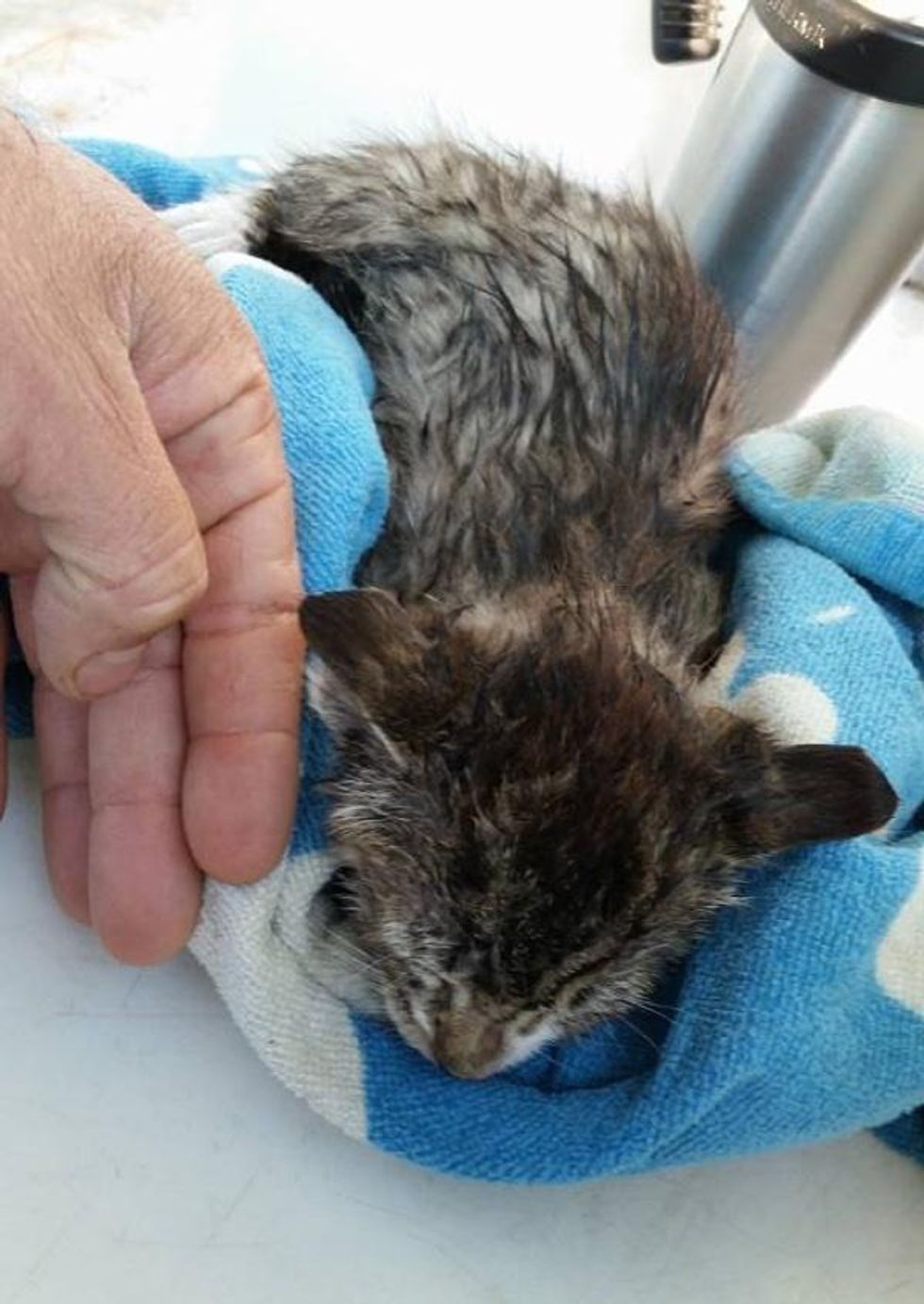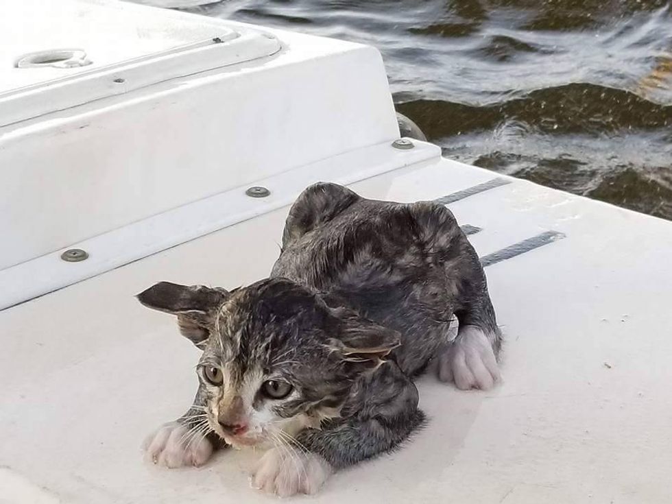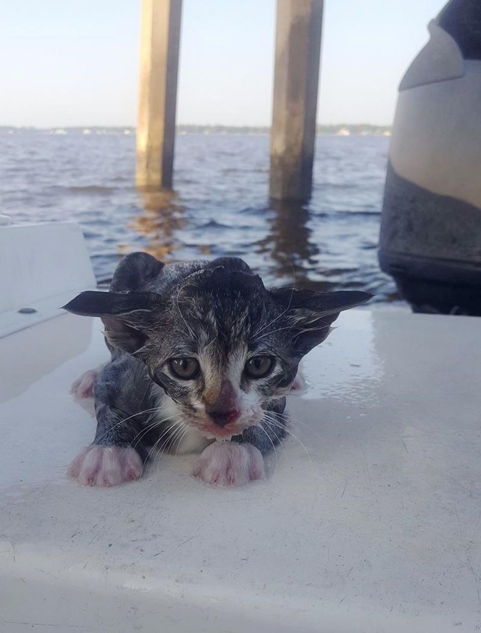 "I pulled the boat up beside it and we realized it was a tiny kitten just barely clinging to life! He could barely keep his head above the water at this point. He had no chance without us," Newman said.