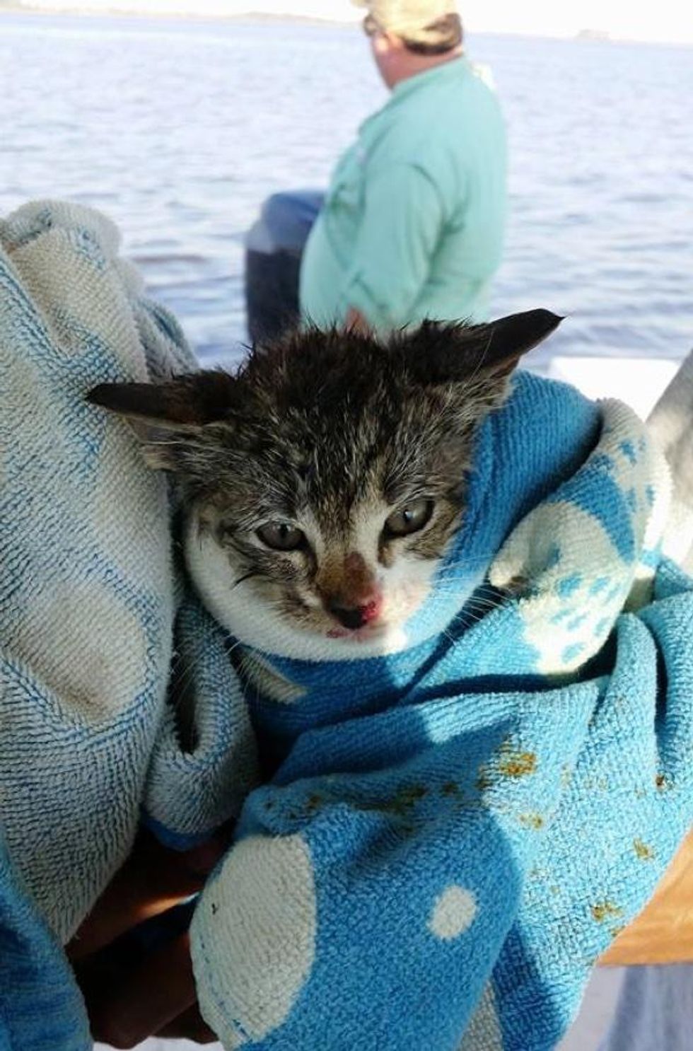The kitten shook off saltwater from his nose and ears. He was a bit shaky but glad to be in safe hands. "We headed for land and quickly took him to the vet."