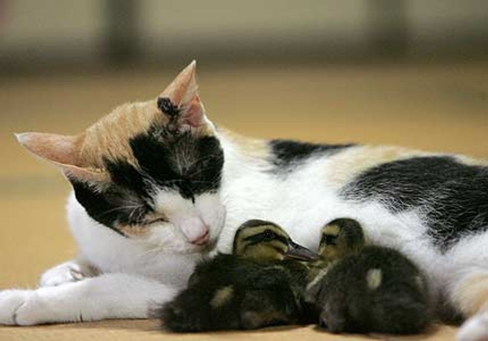 Hiroko lost her three kittens in 2007, but soon after she became a surrogate mother to two ducklings that her owner accidentally left her with. Hiroko immediately began caring for the newly hatched ducklings by grooming them and treating them as if they were her own kittens.