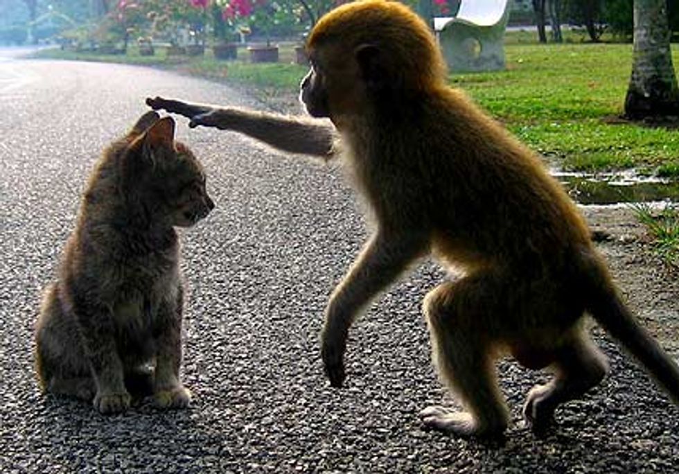 A friendly Macaque monkey and his kitten buddy were spotted in the coastal resort of Kuala Selangor in Malaysia. The monkey was seen patting the kitten on the head. Tourist Kaz Campell who captured the moment spent about two hours with them.