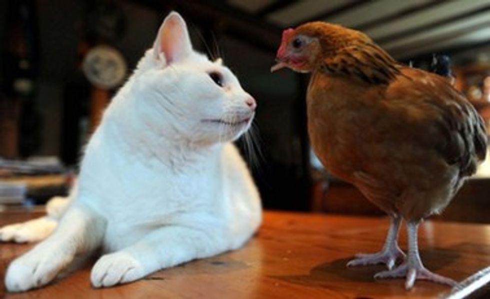 Gladys was the sole survivor of her pen after a fox killed 13 other chickens. Fearing her safety, the farmer relocated her to a farmhouse where Snowy the cat resided. Gladys was lonely and scared, but Snowy was there to provide companionship. Soon they were bonded and became very best friends.