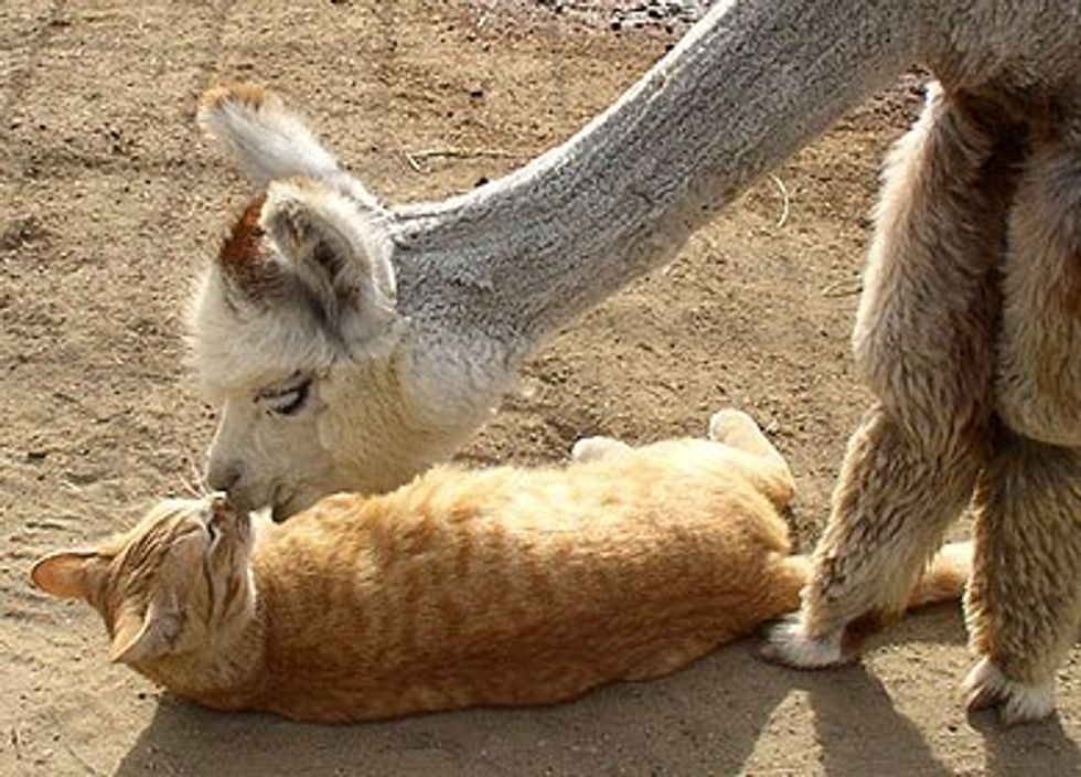 This alpaca has befriended a cat from the farm. They were inseparable.