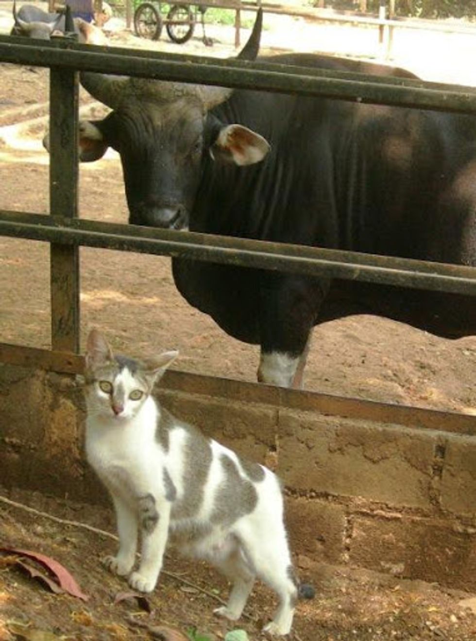 At Bandung Zoo in the City of Western Java, a cat befriends a wild buffalo. They are seen hanging out together like two good buddies.