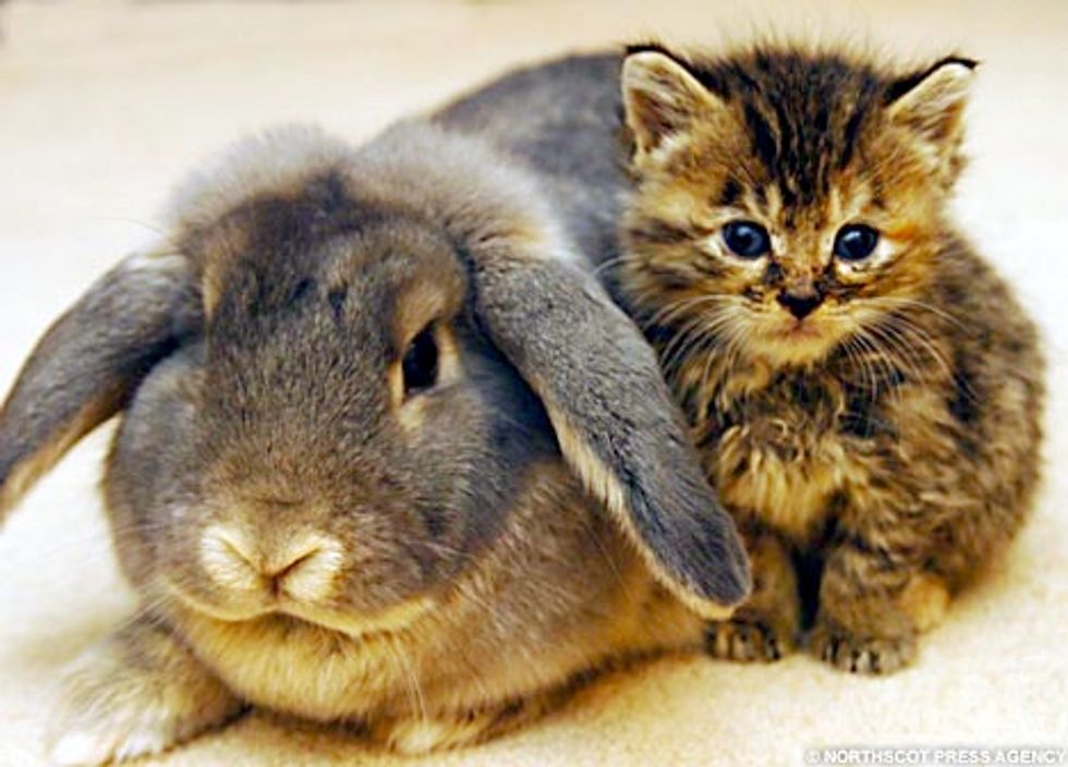 A rabbit named Summer adopted a litter of six abandoned kittens that were brought into a veterinary branch in Aberdeen back in 2007. When she met the five-week-old kittens she immediately bonded with them. The kittens instantly thought she was their mom, climbing all over her and looking to get milk from her. Summer "just sat there and let them do it. Now they follow her everywhere. They can't bear to be without her. They're all so lovely together" said Melanie from Aberdeen.