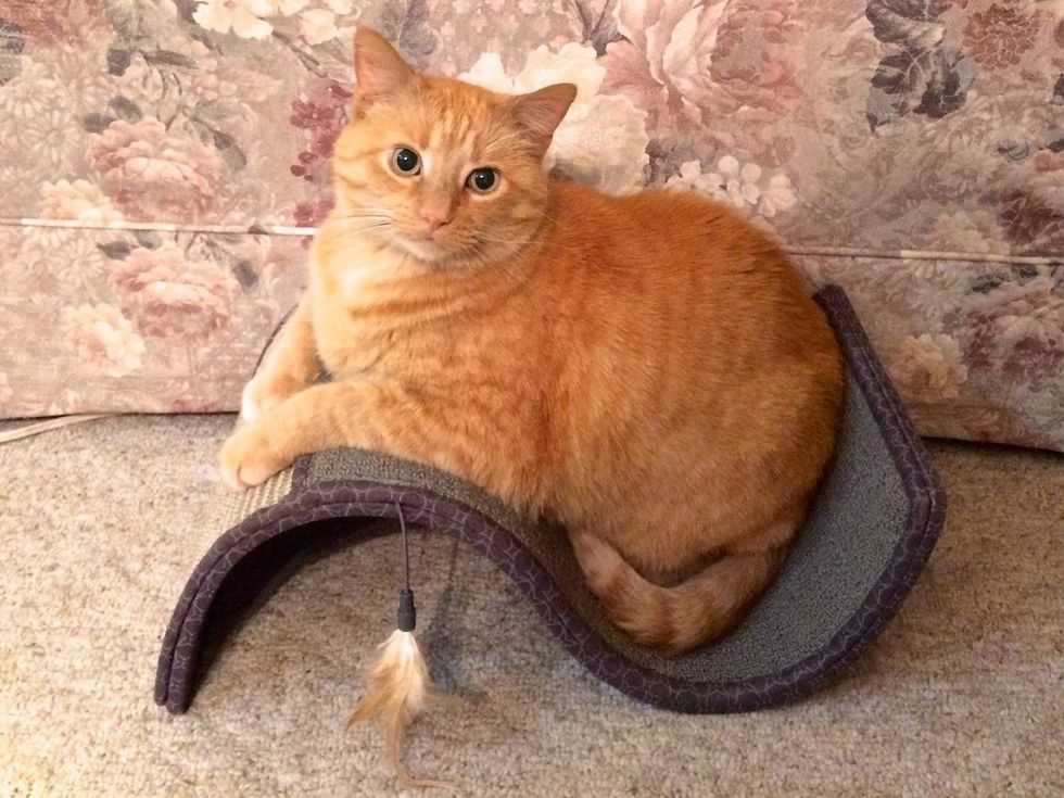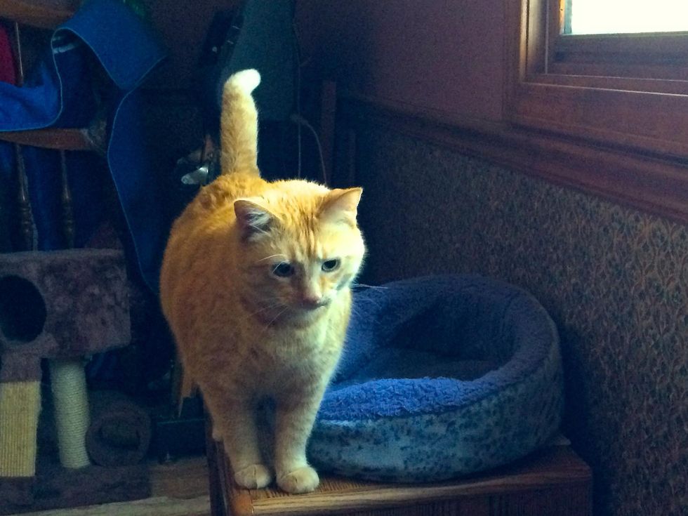 The sweet ginger boy tells his family how happy he is to be loved every day and bring them gifts (toys, something from a basement wall) and greets them with happy meows every morning.