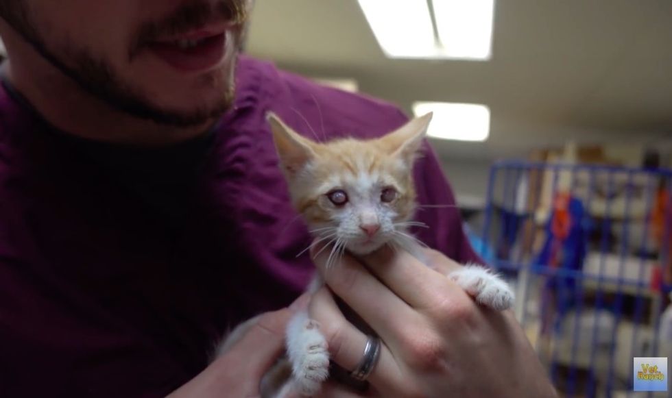 Dr. Matt of Vet Ranch, a homeless animal rescue group, received a sad little orphaned kitten who was found all alone. He came in with two badly infected eyes that were unsalvageable.