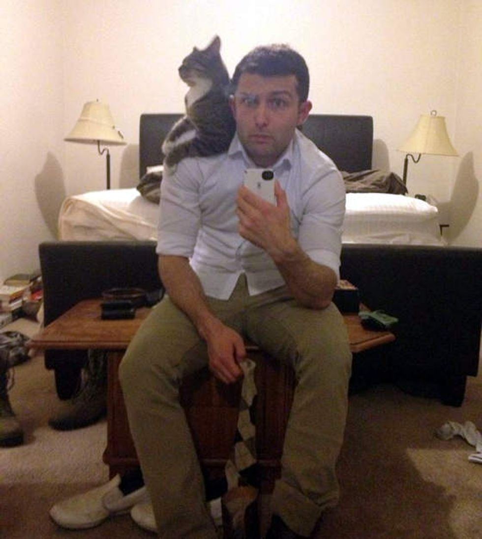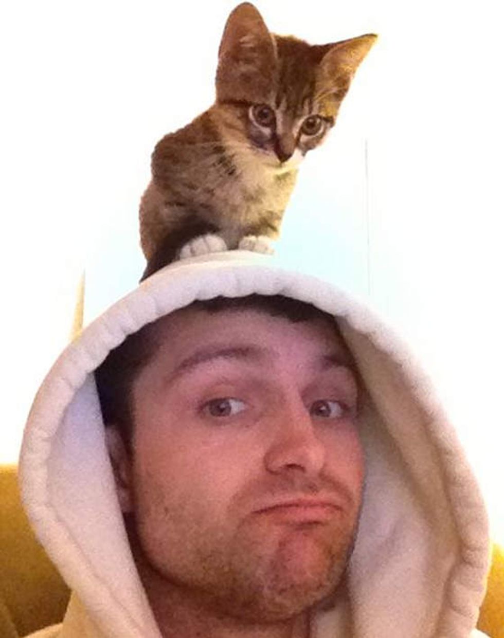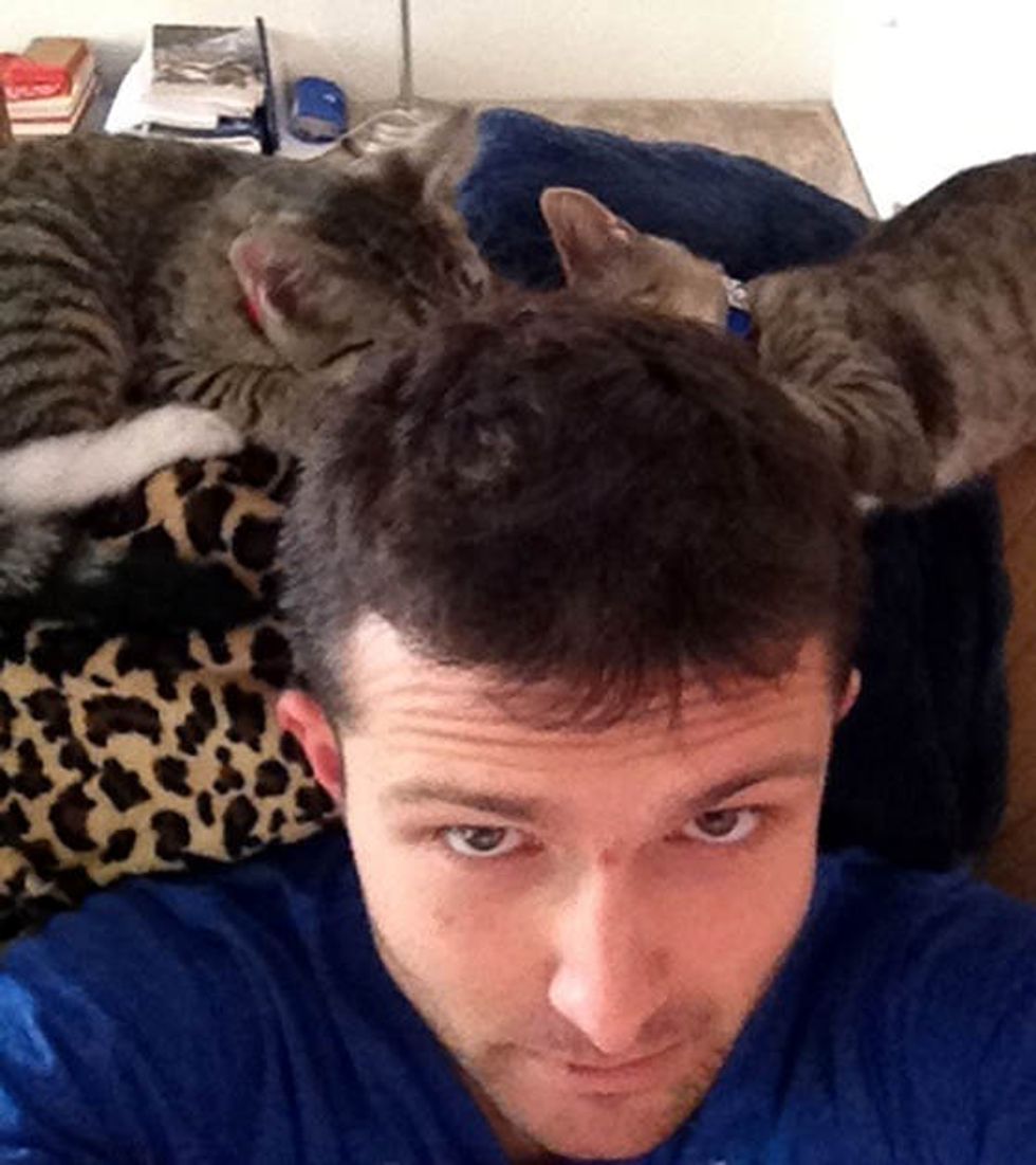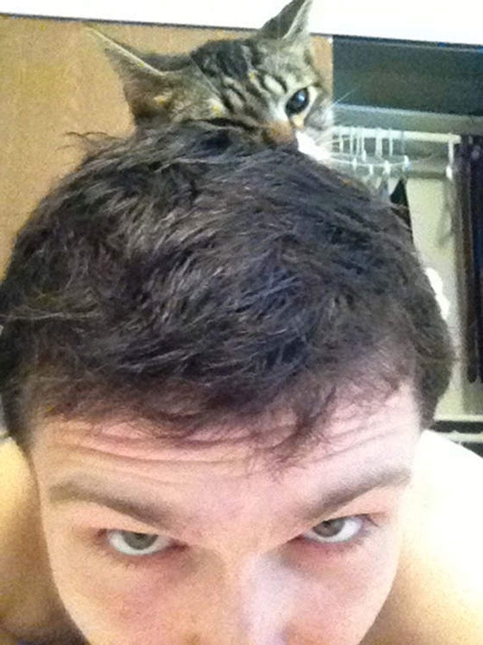When Matt is out of the shower, kitty attempts to dry his hair.