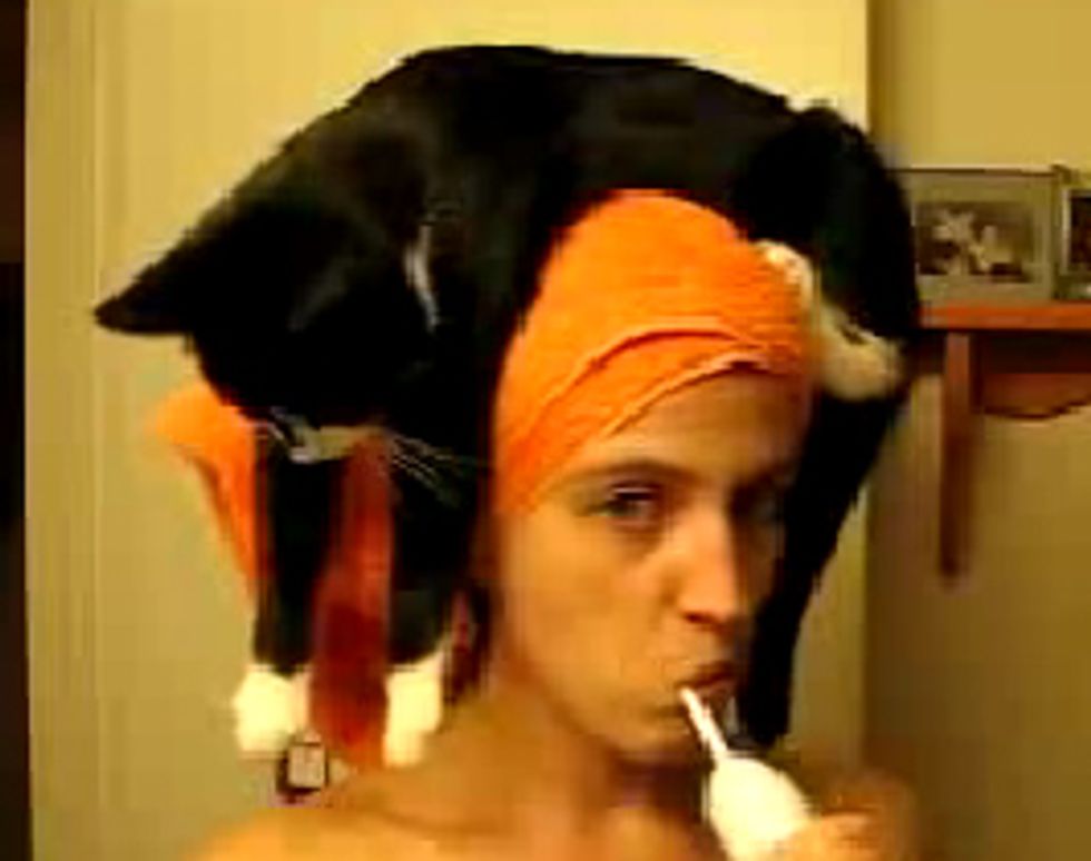 This video is really cute. Maybe I will experiment with the idea tonight, wrap up my hair with a large towel and see if it will be enticing enough for my cats to jump up on it. :-) I have 3 cats, so I have at least 3x bigger chance of that happening.