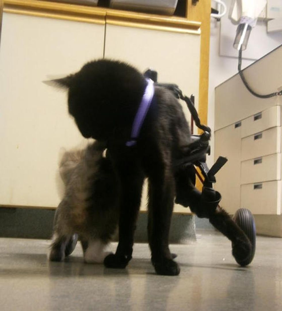 Violet received her new cart and can walk again! Even her foster kitty friend is interested in the fun.