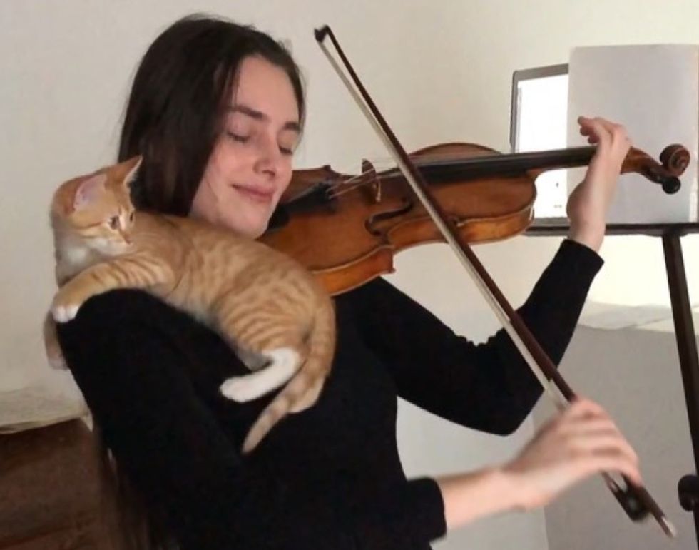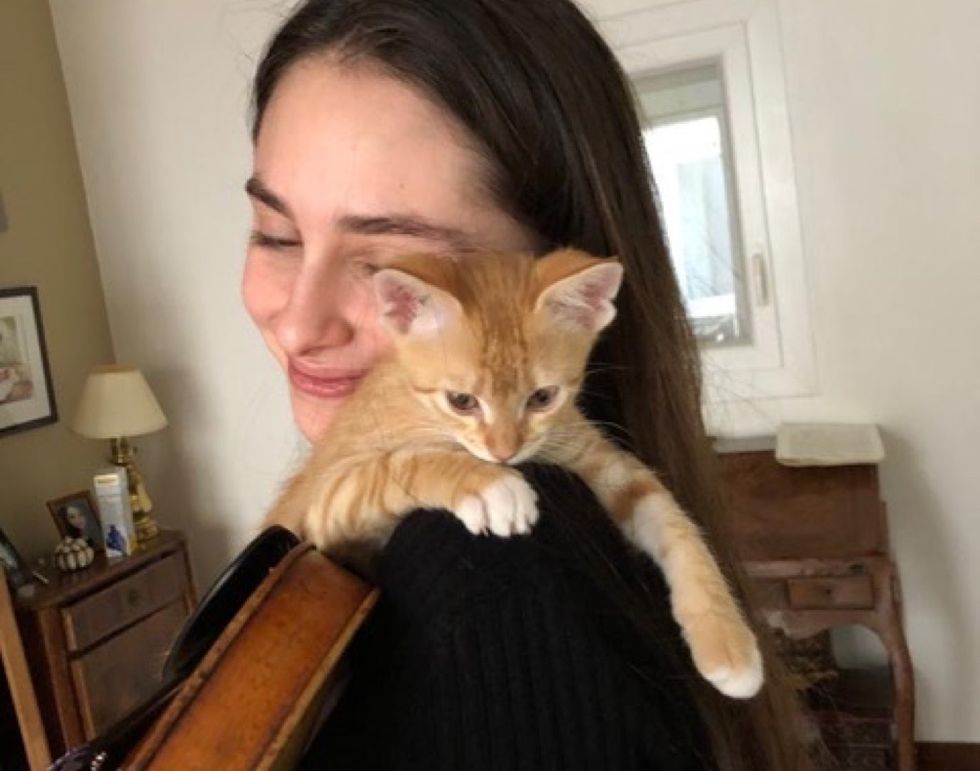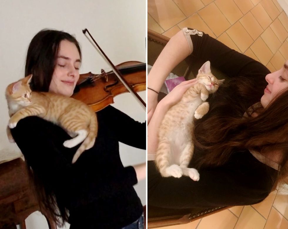 An abandoned kitten found his way to a violinist and became her most adorable audience.