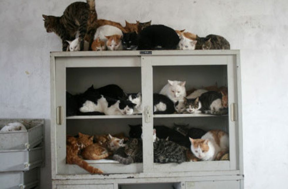 After the rescue, many cats are still afraid of human contact. They snuggle up together in places like this.