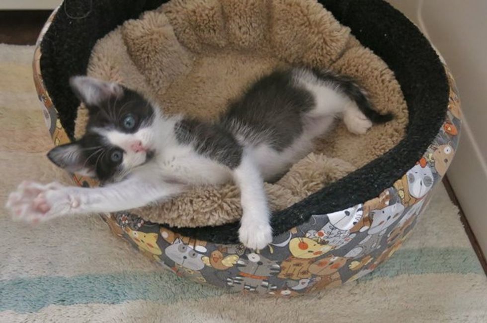 8 weeks old. TeeNee waving 'Hi' to the camera from his comfy bed. What a difference love makes.