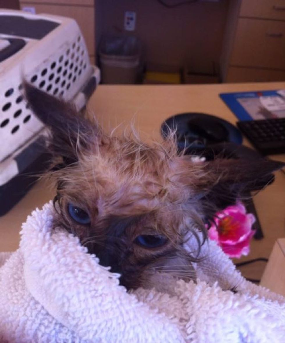They rushed the kitten to the vet to get him cleaned up and checked out. "I hope he isn't too sick; I think he might have a cold," she wrote before the vet appointment.