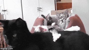 When he comes in, Cate jumps down to greet him and so does the little black fur baby (Cate's mini me). The rest of the brood are lounging in their comfortable cat bed, stretching about!