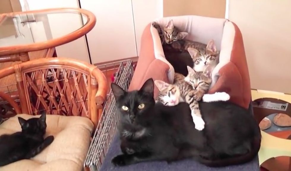 Cate and her kittens are snuggling and relaxing, waiting for their foster dad's return.