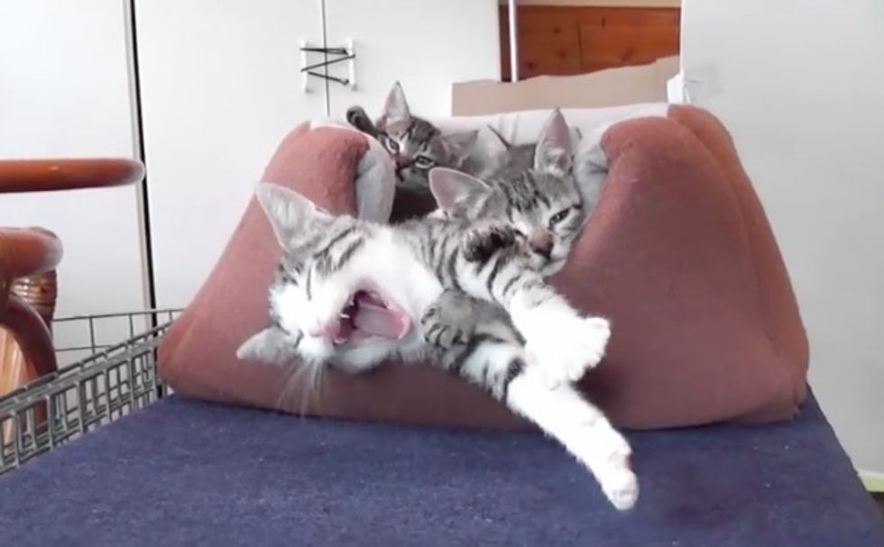 This man comes home to his snuggly and squeaky foster kitties. It just doesn't get any cuter than that.