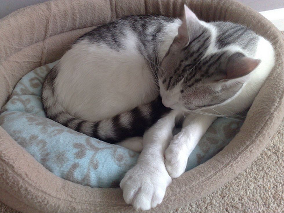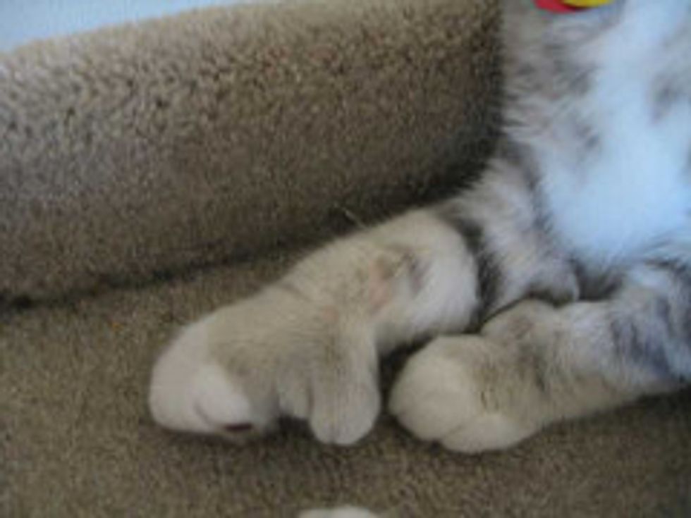 This poor kitty got stung by a bee. His right paw was almost twice the size of his left paw. Yes, cats can get allergic reactions when they get stung by bees, wasps, yellow jackets or hornets.