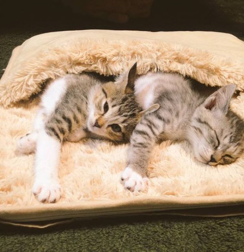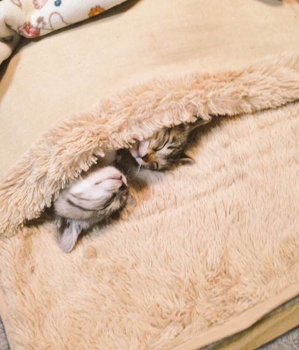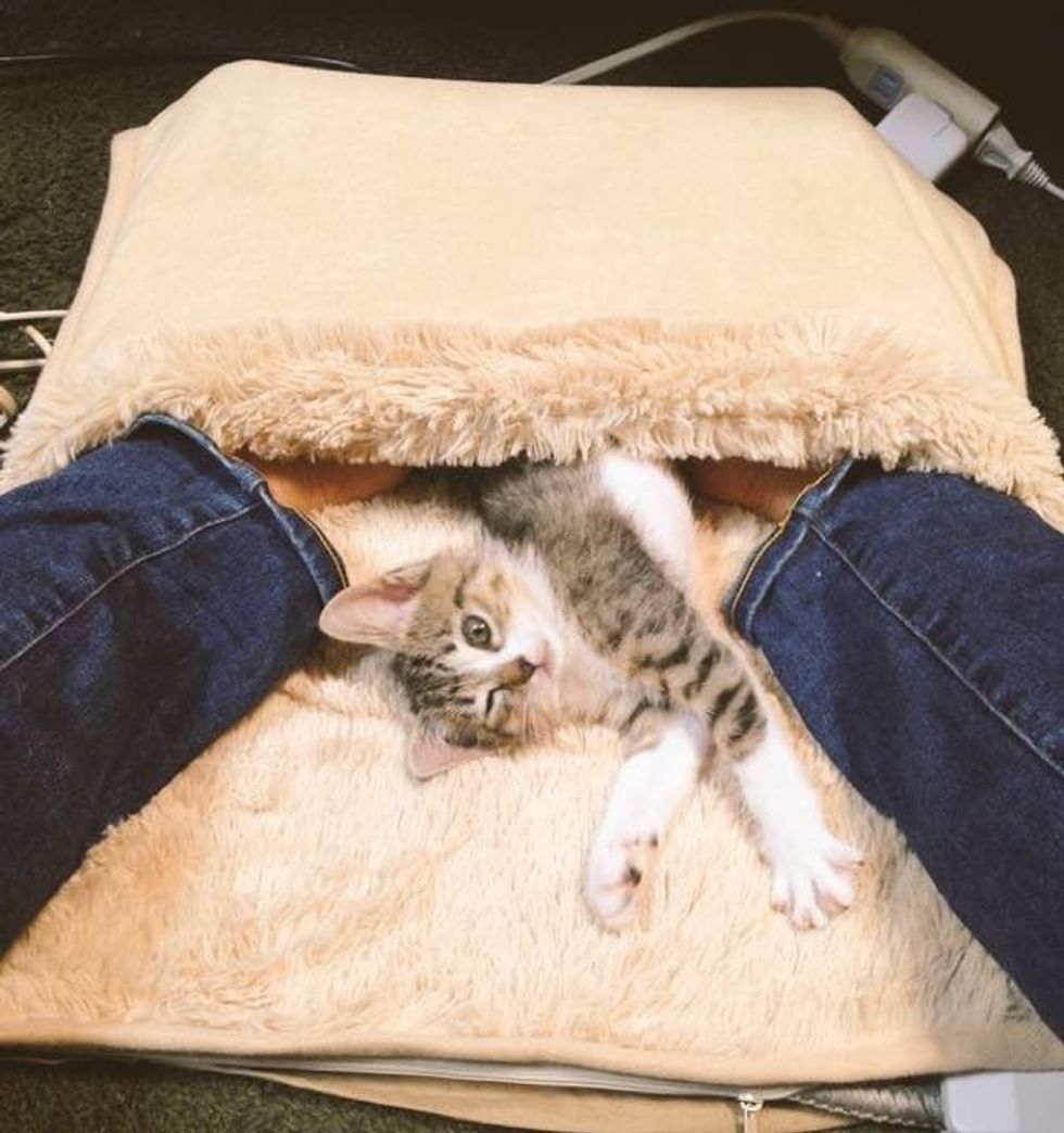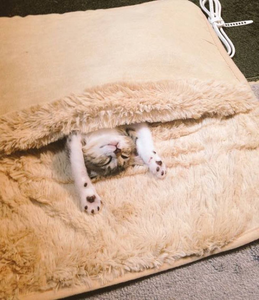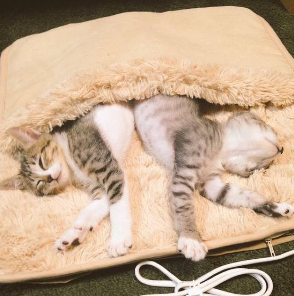 "It's getting cold, so I bought a heated carpet for my feet," the human wrote. As soon as they turned it on, the kittens snuggled right in.
